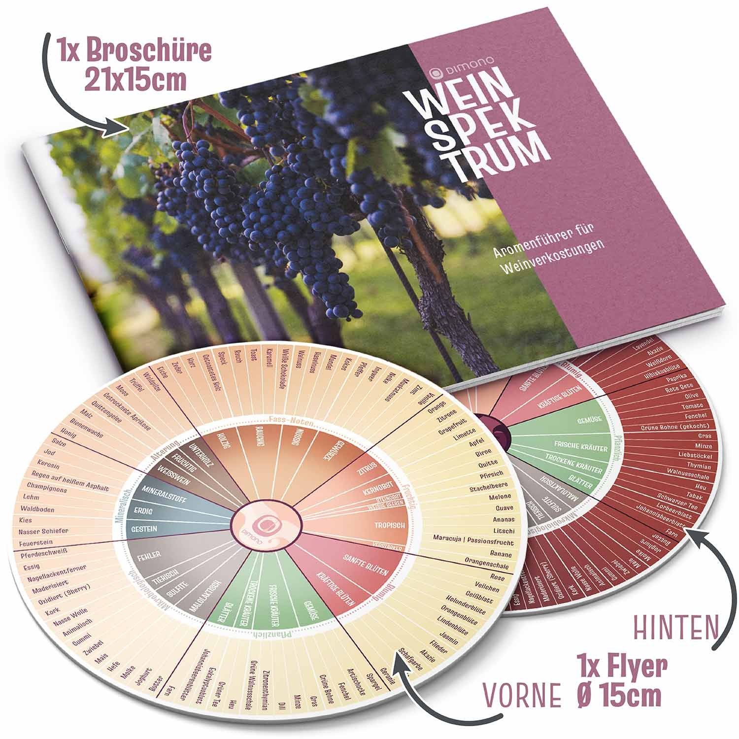Dazu erhalten Sie ein ausführliches Booklet, dass Ihnen die häufigsten und meistgetrunkenen Weißweine und Rotweine anhand dieses Aromarads darstellt. Впередgehende Informationen zu den Rebsorten und deren übliches Geschmacksprofil, dargestellt auf dem Original Dimono Weinrad. Beschenken Sie sich selbst und tauchen Sie tiefer ein, in die genießerische der Weinwelt, oder beschenken Sie einen leidenschaftlichen Weintrinker mit diesem schönen, praktischen und lehrreichen Weingeschenk!