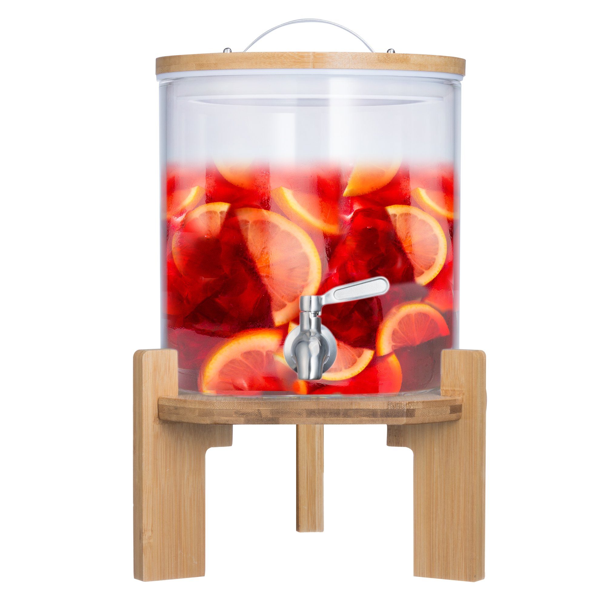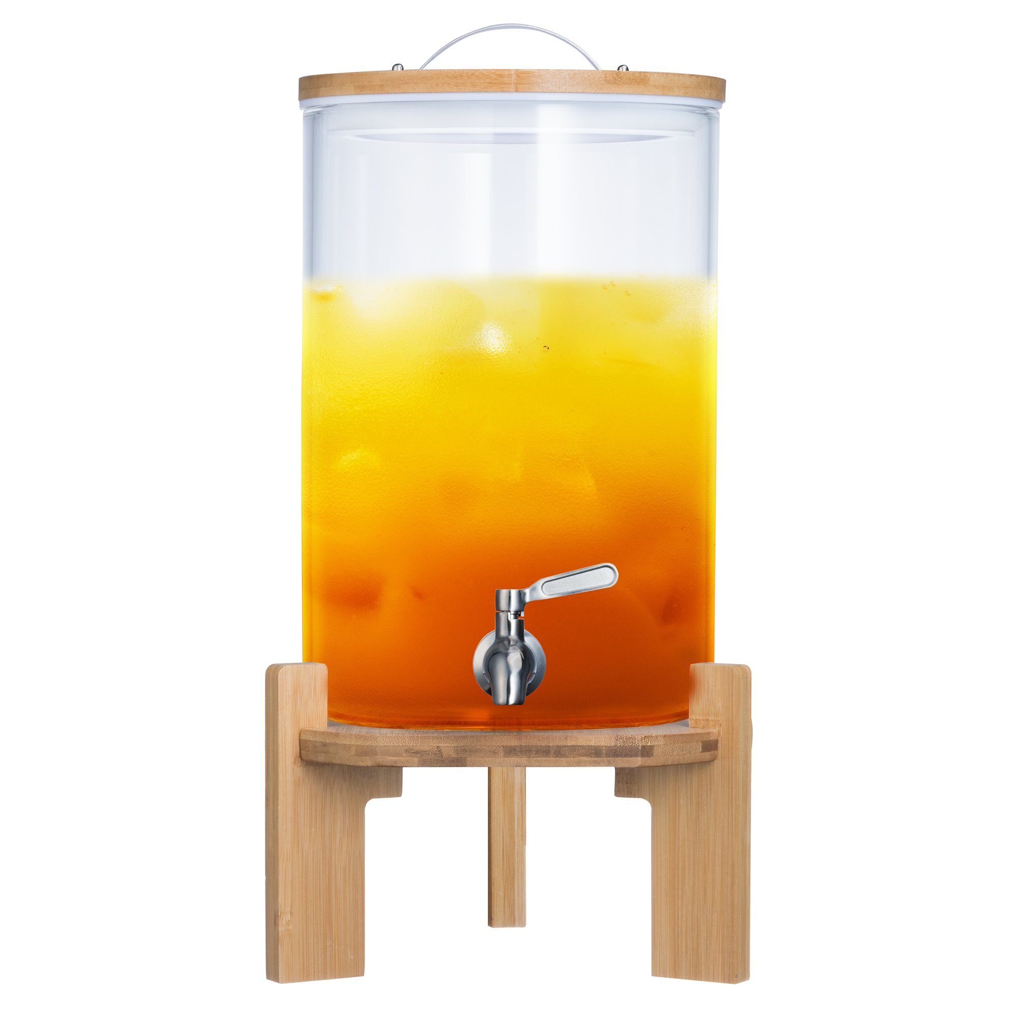 Luxeriöser Getränkespender aus Bambus mit tropfischerem Zapfhahn aus rostfreiem 304 Edelstahl. In den zwei Jumbo Größen mit 5 Liter und in besonders groß mit 8 Liter Fassungsvermögen. Komplett luftdichter Verschluss hält die Getränke lange frisch. Wunderbar für Eistee, selbstgemachte Limonaden, Bowlen, Alkoholische Mischgetränke, oder aromatisiertes Wasser und Tees. Zur Präsentation auf einem besonders schicken Bambus-Ständer. Tun Sie gleichzeitig was für Ihre Gesundheit und für Ihr Wohlbefinden, mit dem stilvollen Getränkespender von Dimono.