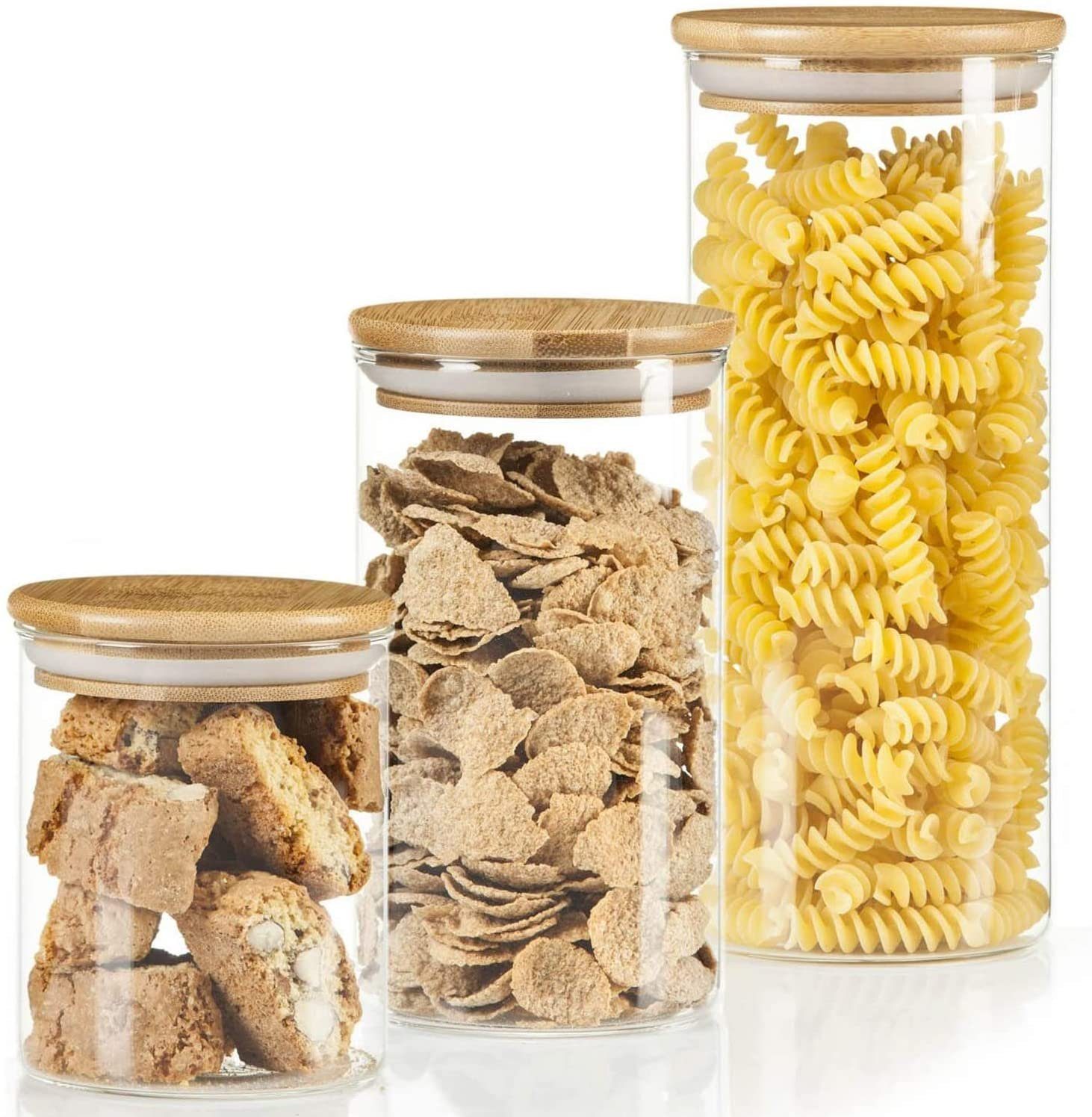 Die formschönen Vorratsgläser aus hitzebeständigem Borosilikatglas sind nicht nur schick, sondern auch ganz besonders praktisch: Dank des integrierten, luftdichten Verschlusses mittels stabilem Deckel aus Bambus, sind alle Vorräte und Lebensmittel hygienisch und sicher verschlossen. So schaffen Sie Ordnung, sparen Platz und halten Ihre Vorräte deutlich länger frisch. Selbstverständlich sind die Glasbehälter dabei stapelbar und für eine Fülle von verschiedenen Lebensmitteln zu gebrauchen. Egal ob Müsli, Reis, Mehl, Zucker, Gewürze, Süßigkeiten, Kekse oder Nudeln - selbst als Bonbonglas machen sie eine gute Figur. Schaffen Sie Ordnung in Ihrer Küche - oder haben Sie Platz zu verschenken?