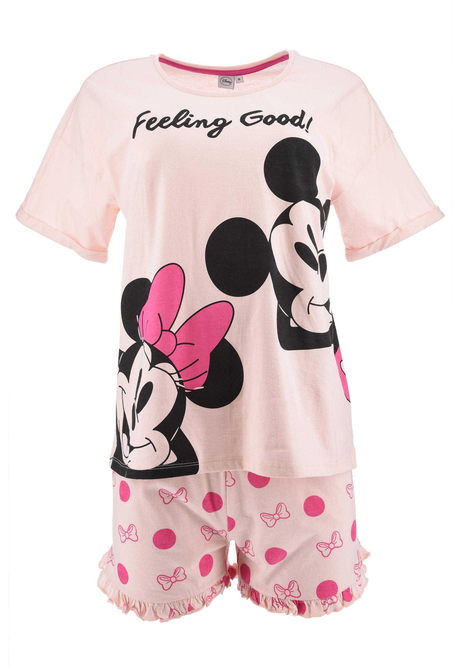 Süßer Damen Sommer-Schlafanzug mit Minnie Mouse Motiv auf Oberteil und Hose. Durch die verwendete Baumwolle haben Ihre Kleinen ein angenehmes Tragegefühl.