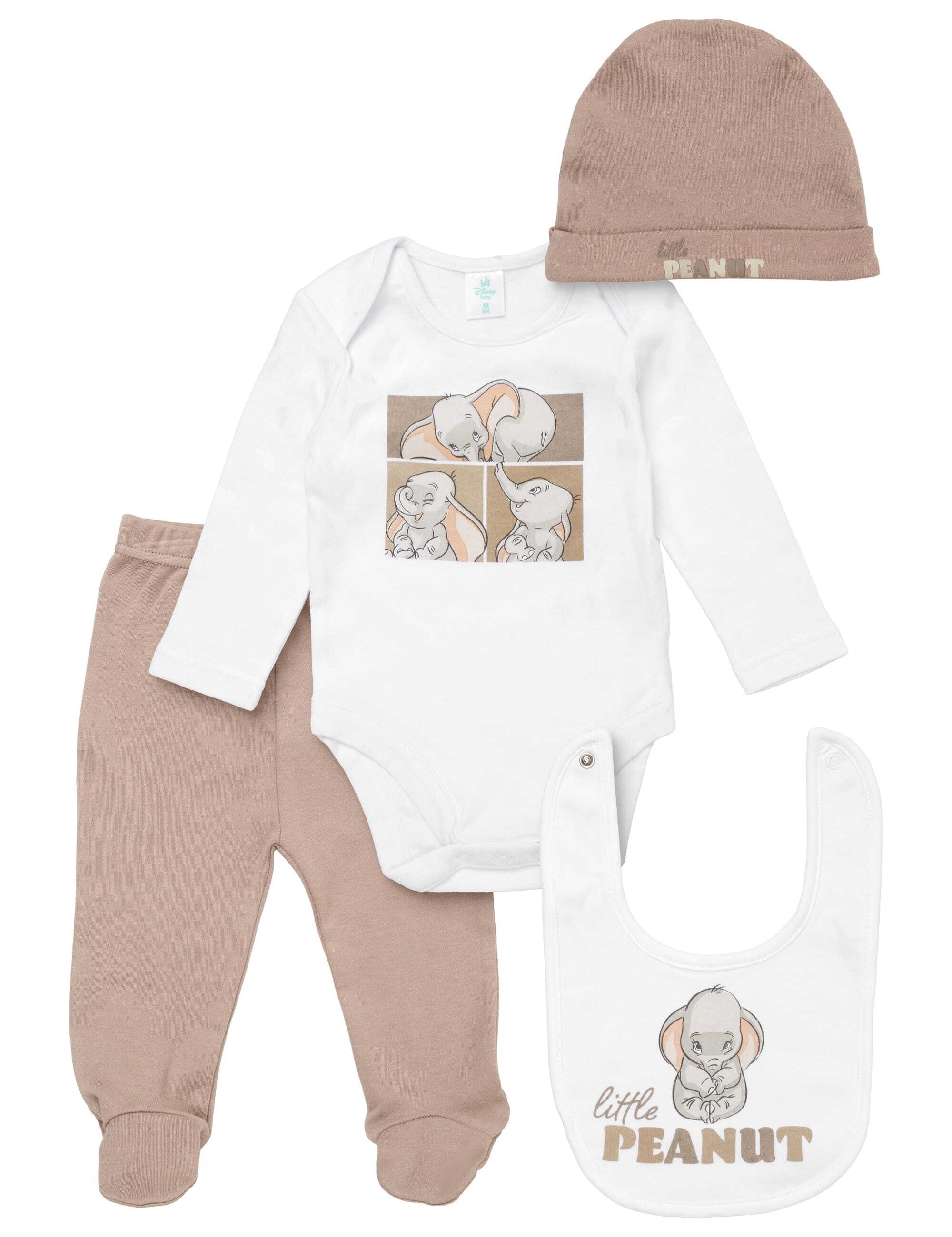 Hast du schon alle Geschenke für die Babyparty zusammen? Oder stehst du selbst kurz vor der Geburt deines Kindes und freust dich schon auf die ersten Glückwünsche? Egal ob du schenkend bist oder beschenkt wirst – die Frage nach dem perfekten Geschenk zur Geburt beschäftigt uns alle. Und mit diesem tollen Set liefern wir dir die Antwort gleich hinterher. Dieses Set für die ersten Lebensmonate ist die perfekte Wahl! Es ist ein komplettes Outfit für deinen kleinen Schatz, was du so aus dem Schrank und direkt anziehen kannst. Damit ist es nicht nur ein Geschenk, sondern ein Begleiter für die ersten aufregenden Monate im Leben des kleinen Erdenbürgers, denn etwas, das von Herzen kommt, sollte auch hochwertig sein. Dieses bezaubernde Set beeindruckt durch seine herausragende Qualität und das besonders weiche Material, das für optimale Atmungsaktivität, eine hervorragende Passform und angenehmen Tragekomfort sorgt. Dein Baby wird sich darin rundum wohl und geborgen fühlen. Das liebevolle Design und der moderne Materialmix machen dieses Set zu etwas ganz Besonderem. Der langärmelige Body begeistert mit einem liebevoll gestalteten Elefanten-Motiv und verleiht dem Set einen zauberhaften Charme. Auch Hose, Mütze und Lätzchen sind farblich harmonisch aufeinander abgestimmt und bieten dank weicher Materialien viel Tragekomfort. Der „Little Peanut“-Schriftzug auf Lätzchen und Mütze rundet den Look perfekt ab. Auch werden Eltern und Kind das durchdachte Design gleichermaßen schätzen, denn dank der praktischen Anordnung der Druckknöpfe und der elastischen Bündchen wird das An- und Ausziehen erleichtert, und das Wickeln wird zum Kinderspiel. Dieses Set ist auch eine wunderbare Geschenkidee zur Geburt. (C02147-001)