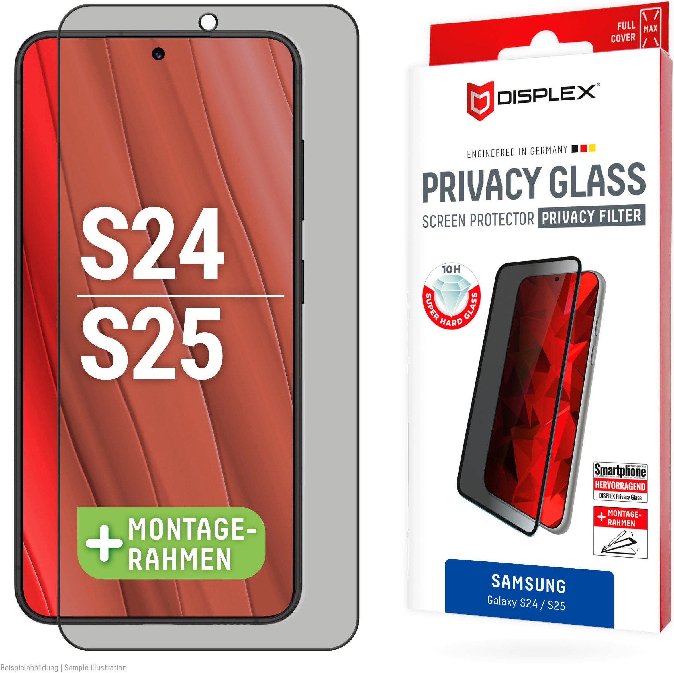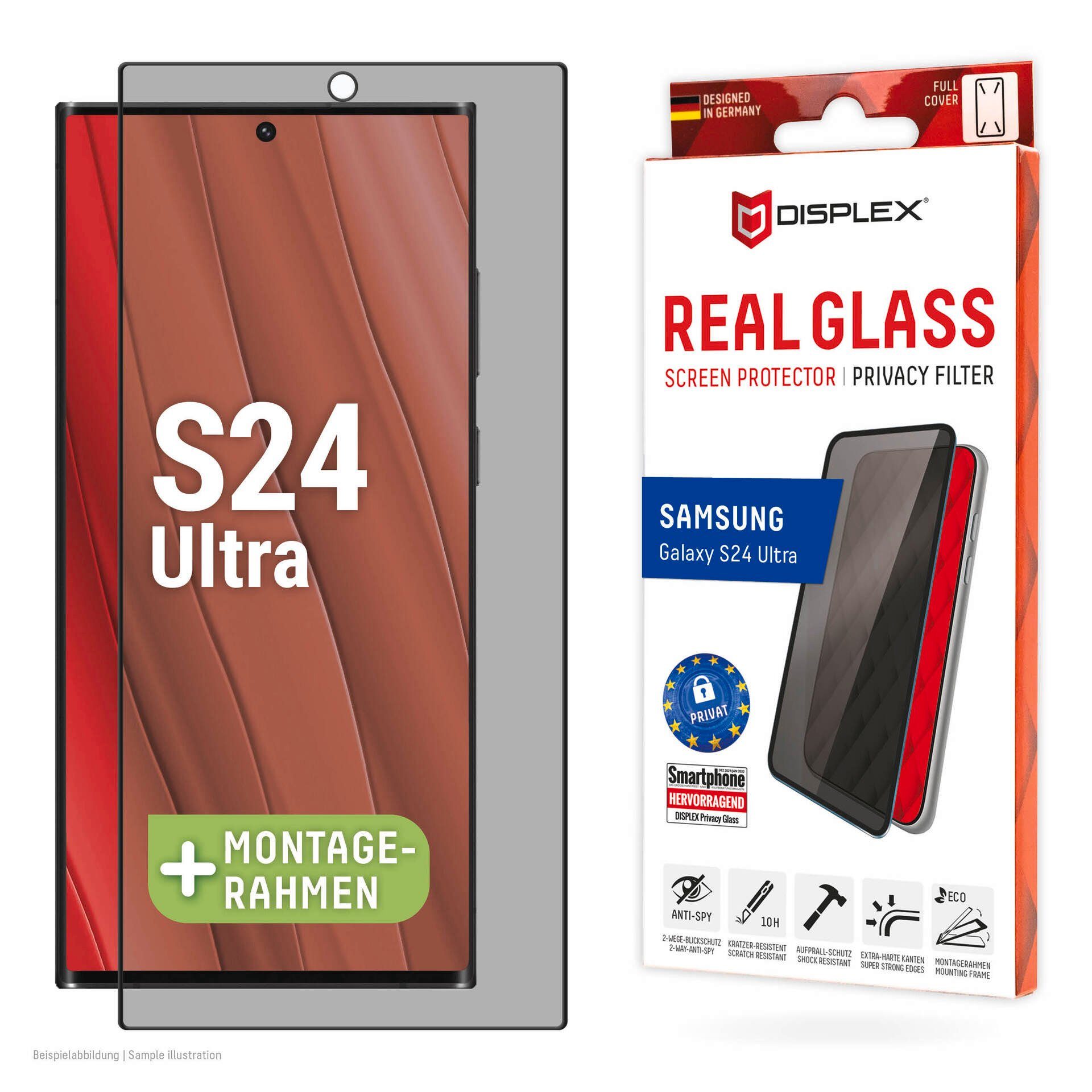 PRIVACY Full Cover Real Glass mit EASY-ON Eco-Montagerahmen Privacy Filter Dank dem speziellem Privacy-Filter, der in das Schutzglas integriert ist, wird das Display-Licht nur aus einem bestimmten Blickwinkel durchgelassen. Der integrierte Blickschutzfilter bewirkt, dass das Display-Licht nur bei frontalem Blick auf das Gerät ausgestrahlt wird. Glas- und Kantenhärte Das Displex Panzerglas hat einen Härtegrad von 10H und ist damit nicht nur kratz-, bruch-, und stoßfester als vergleichbare Markenprodukte, sondern übertrifft sogar hochwertiges Saphirglas (9H), das bei Luxusuhren eingesetzt wird. Hüllenfreundlich Das Displex Schutzglas wird bis auf 5/100 mm genau auf die Smartphone Konturen gefertigt und passt somit perfekt auf Ihr Smartphone. Außerdem ist die Schutzfolie ultradünn. Somit lassen sich alle handelsüblichen Schutzhüllen & Cases mit der Panzerglasfolie benutzen. Anti Fingerprint Die oberste Schicht der 5-Layer Technology besteht aus einem High-Tech Plasma Coating. Die hydrophobe Anti-Fingerprint-Beschichtung ist fett- und schmutzabweisend, extrem langanhaltend und gewährleistet optimalen Touch und Scrollen. Splitterschutz Der im Real Glass integrierte High-Tech Splitterschutz von Displex gewährleistet absolute Sicherheit, auch beim Bruch des Panzerglases. Durch das Verbundmaterial der zweiten Schicht im Schutzglas splittert dieses nicht und garantiert somit eine absolut sichere Verwendung. Einfaches, blasenfreies Aufbringen Mit dem EASY-ON Eco-Montagerahmen und dem dazugehörigen Video Tutorial gestaltet sich die Montage des Tempered Glass schnell, einfach und exakt. Das Ergebnis: kein schiefes Aufliegen des Screen Protectors auf dem Display, keine verdeckten Öffnungen für Lautsprecher oder Mikrofone und erst recht keine Blasen unter dem Schutzglas. Gut für die Umwelt: der Eco-Montagerahmen besteht zu 100% aus recyclebarem Premium-Vollkarton und kann nach dem Einsatz bedenkenlos mit dem Altpapier recycelt werden.