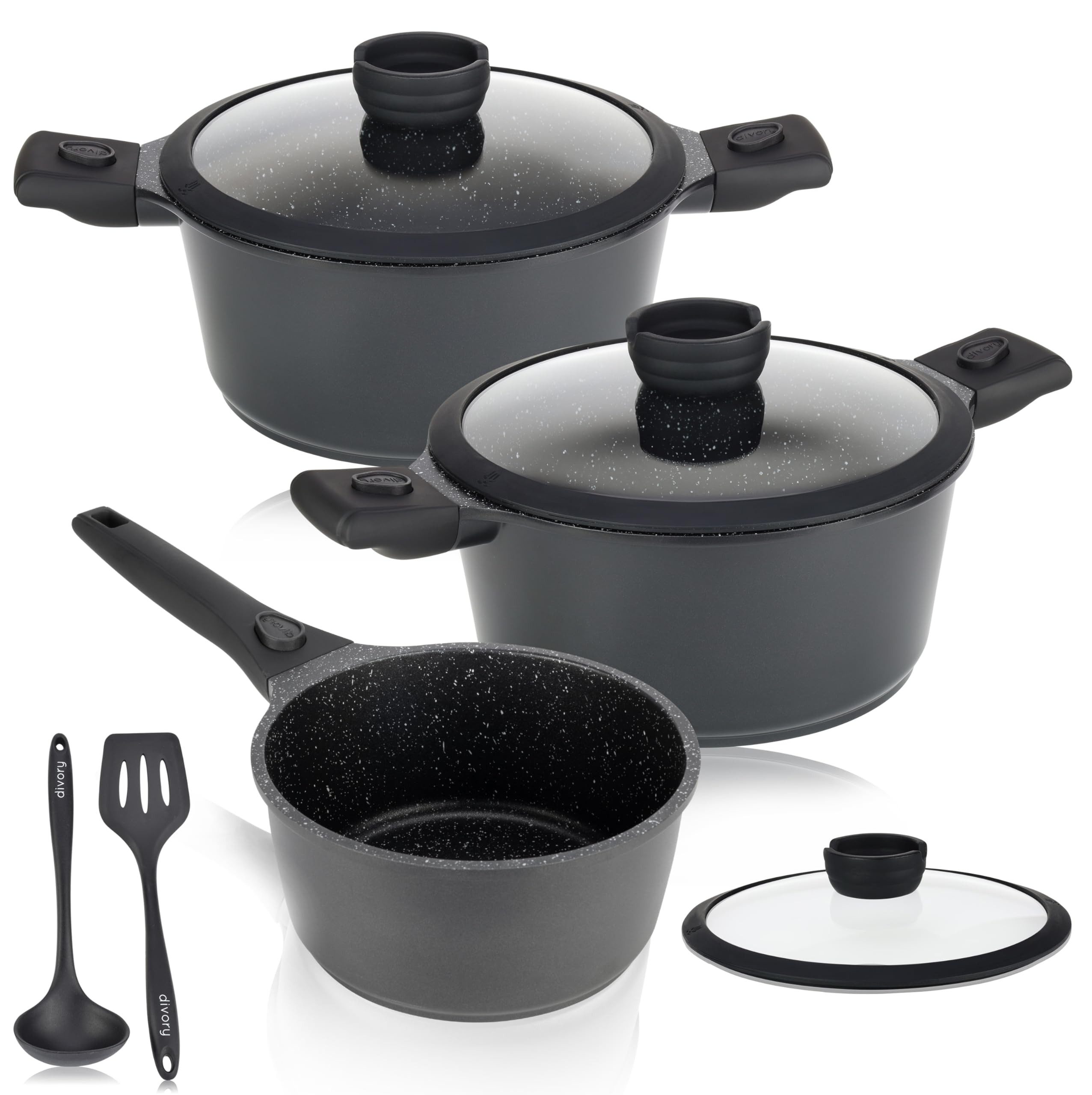 Das DIVORY Topfset bietet Ihnen eine hochwertige Kochlösung mit vielseitigen Anwendungsmöglichkeiten. Все Töpfe sind mit einer speziellen 3-lagigen PTFE Antihaftbeschichtung ausgestattet, die in Deutschland entwickelt wurde. Diese Beschichtung ermöglicht es, mit wenig Öl zu kochen und sorgt dafür, dass nichts anbrennt. Zudem sind die Töpfe frei von APEO.