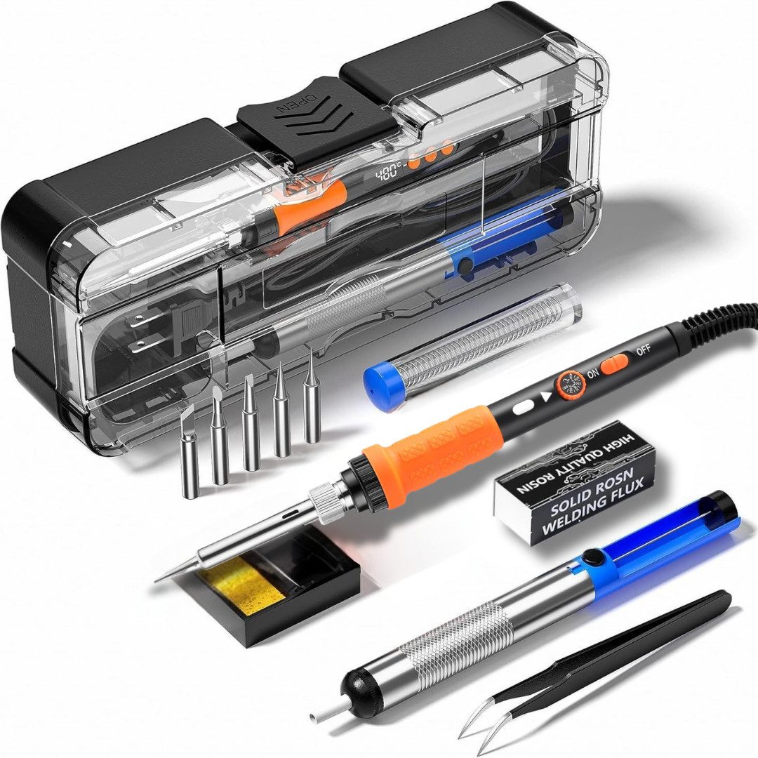 Im Lieferumfang enthalten ist alles, was Sie für den sofortigen Start benötigen: mehrere hochwertige Lötspitzen für unterschiedliche Anwendungsbereiche, Lötpaste, gut leitfähiger Lötdraht, eine robuste Pinzette mit lasergeschweißten Enden, ein leistungsstarker Lötsauger sowie ein sicherer Lötkolbenständer. Der mitgelieferte Werkzeugkoffer schützt das Zubehör und bietet zusätzlich Platz für weiteres Werkzeug.