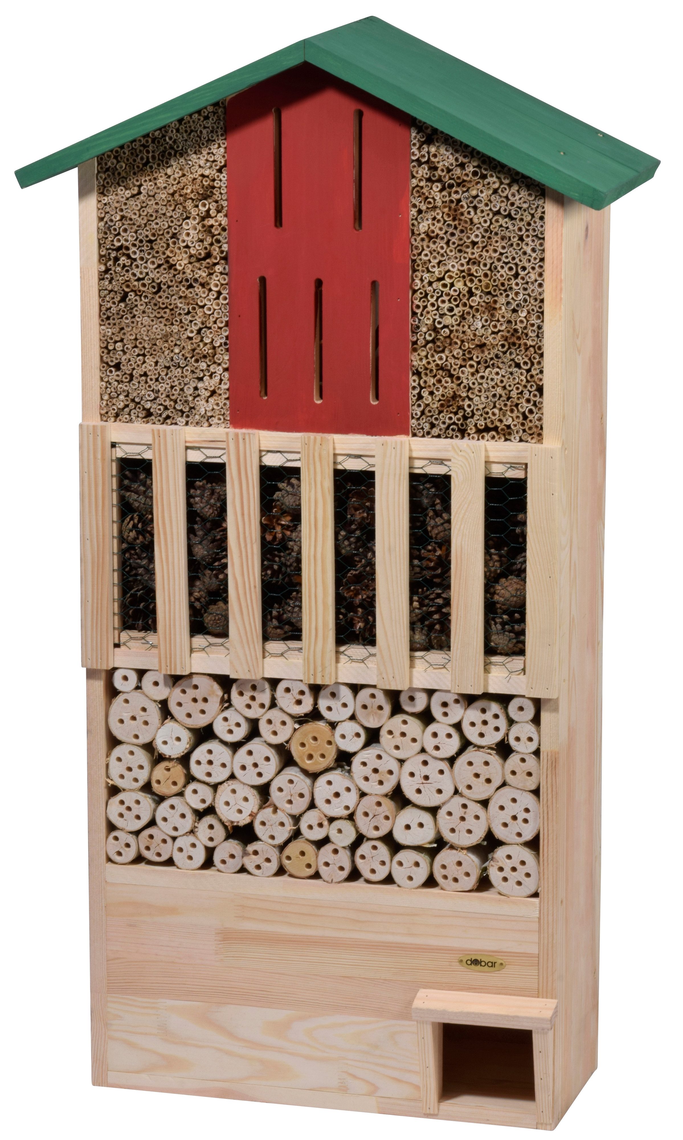 Dieses große, freistehende Insektenhotel bietet Ihnen die Möglichkeit, verschiedene Wildbienen, Schmetterlinge und viele andere Nützlinge direkt bei Ihnen im Garten anzusiedeln.