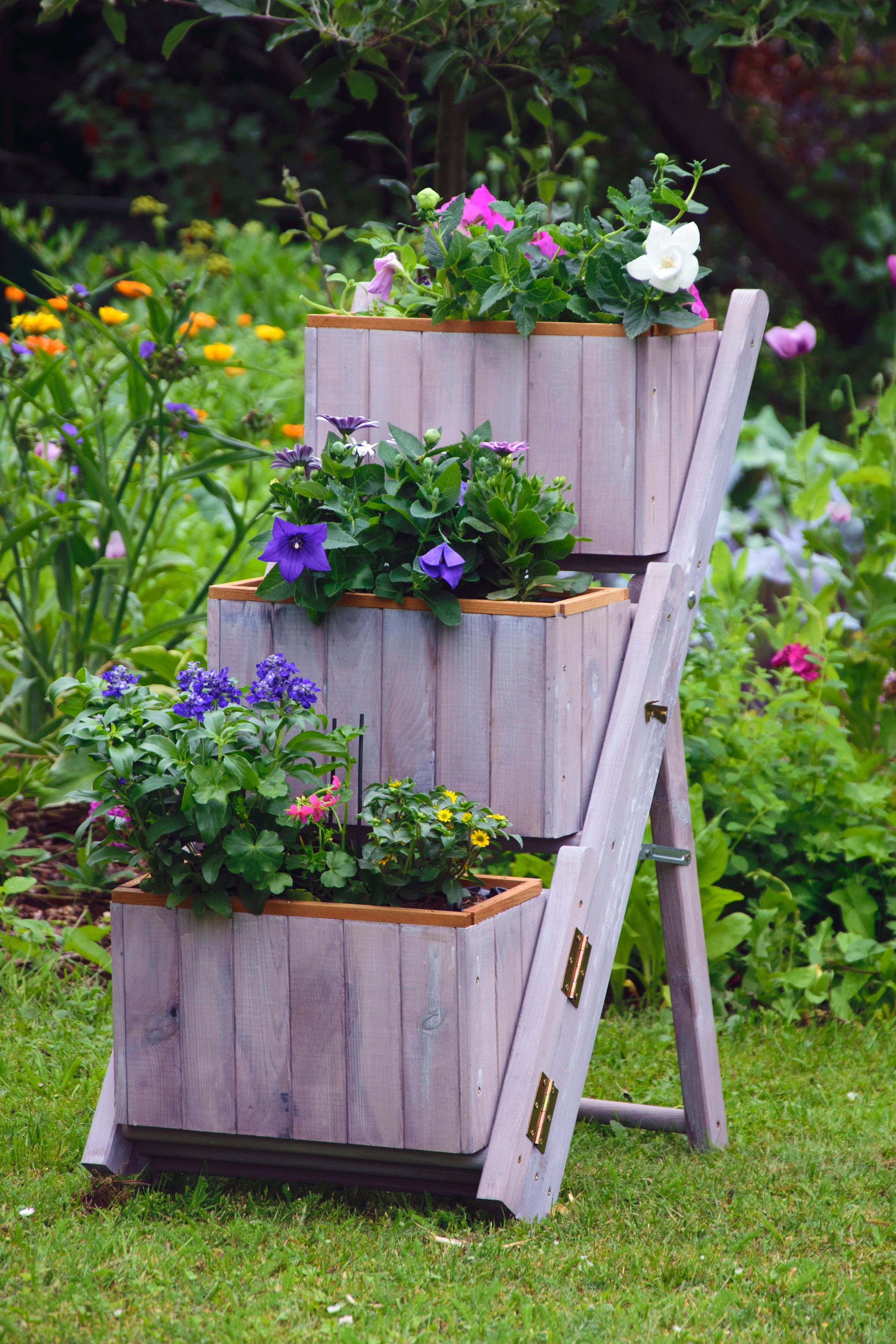Der genial vielseitige Hingucker für deinen Garten! Die dreistufige Pflanztreppe für Garten, Terrasse oder Balkon hat viele Gesichter. Ihre drei Pflanzkästen können platzsparend übereinander stehen oder seitlich ausgeklappt werden, wodurch ganz neue Gestaltungsmöglichkeit entstehen. Zudem können die drei Pflanzkästen mit Pflanzfolie einzeln ausgehängt werden, was die Bepflanzung der Blumentreppe erheblich erleichtert. Im zusammengeklappten Zustand lässt sich die Pflanzenleiter platzsparend verstauen. Sie besteht aus robustem, wetterfest imprägniertem Kiefernholz und wiegt knapp 8 kg.