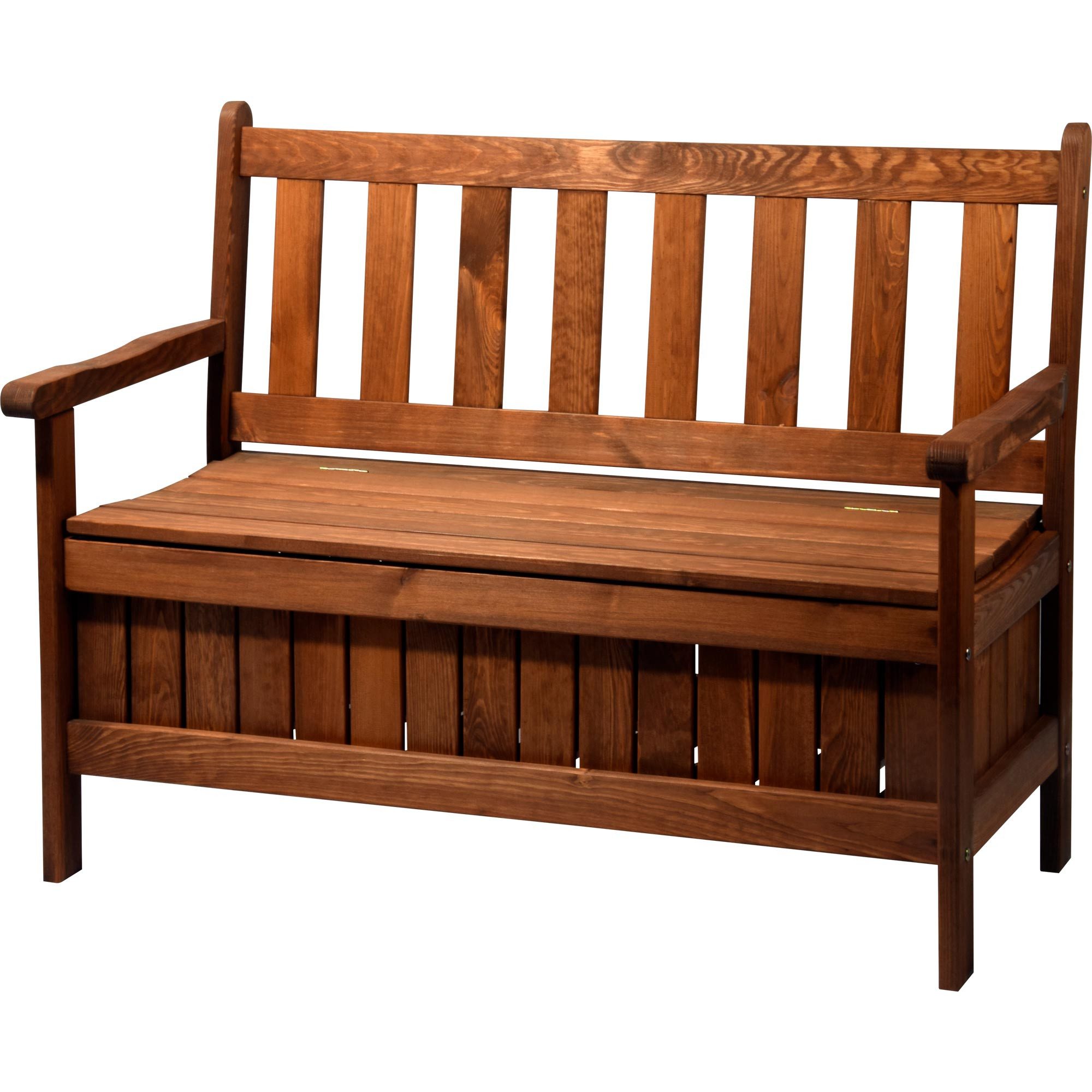 Hochwertige Truhenbank aus Holz mit Rückenlehne und Seiten-Lehnen (2-Sitzer Kastenbank mit Stauraum). Unsere Bank für den Garten aus braun geöltem Massivholz rustikal bietet Ihnen eine schöne und garantiert robuste Sitzgelegenheit. Sie besteht aus einem tragfähigen Staubox-Grundgerüst und einer Rückenlehne und zwei Seitenlehnen. An das Staufach kommen Sie ganz bequem, indem Sie die Sitzfläche mittels zwei Metallscharnieren nach oben klappen. Gönnen Sie sich ein schönes Gartenleben mit diesem klassischen und komfortablen Gartensitzmöbel. Damit diese traditionelle Sitzbank aus Holz über mehrere Saisons und Witterungsverhältnisse bestand hat, wurden die Bauteile aus hochwertigem Kiefernholz gefertigt, welche zuvor zum Witterungsschutz imprägniert wurden. Dazu wurde eine spezielle Lasur auf Öl-Basis für einen dekorativen braunen Farbton bzw. Farbverlauf gewählt. Die natürliche Holzstruktur bleibt so noch für einen gewissen Teil erhalten, und bietet Ihnen einen praktikablen Kompromiss zwischen wetterfester Funktionalität und ansprechender Optik. So garantiert die Gartenbank einen sicheren Schutz vor Feuchtigkeit und Kälte. Um der Verantwortung für unsere Natur gerecht zu werden, wird die Bank aus nachweislich zertifiziertem europäischem FSC-Holz hergestellt. Der Holz-Rohstoff stammt somit aus nachhaltiger Waldbewirtschaftung. FSC-Kiefernholz (hauptsächlich) mit brauner Öl-Schutzlasur-Imprägnierung, Длина: 115 cm, Höhe Rückenlehne vom Boden: 89 cm, Banktiefe: 58 cm, Gewicht: schwere 22,5 kg