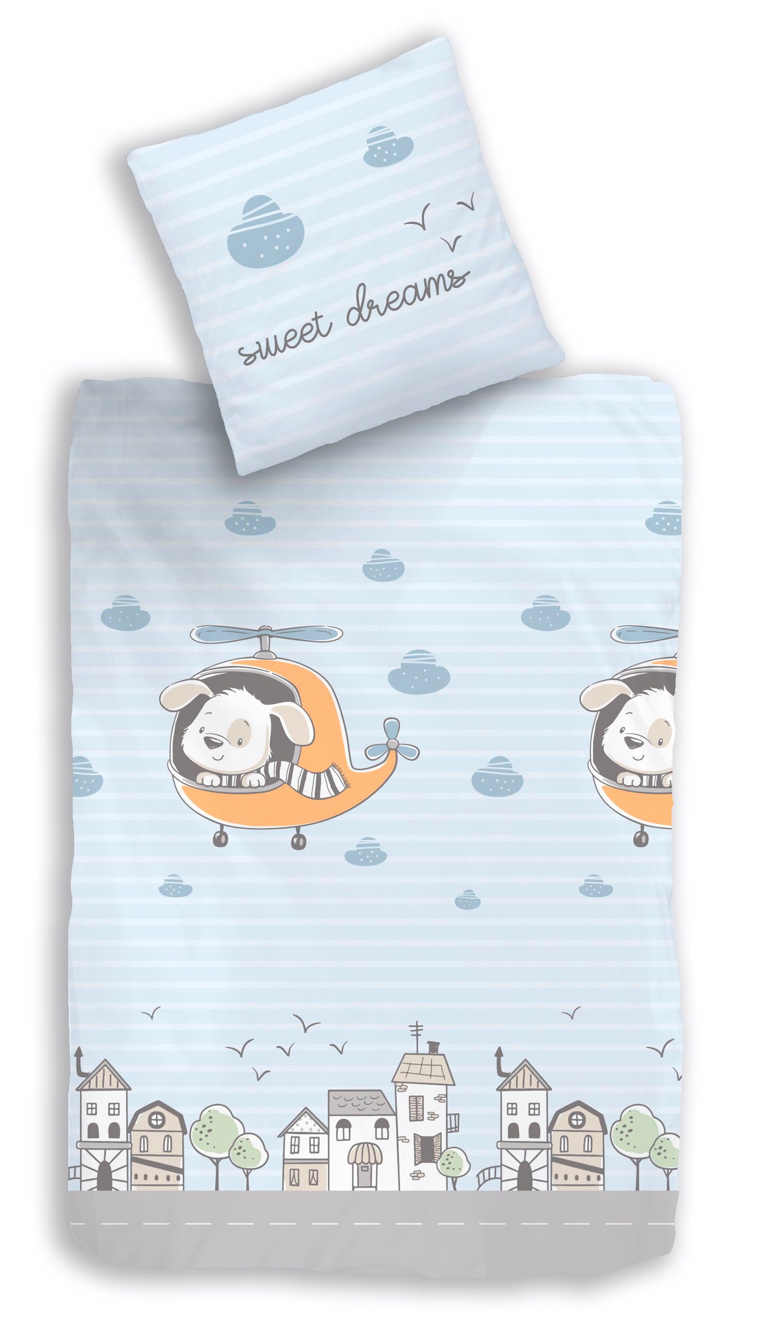Diese Kinderbettwäsche begeistert mit einem verspielten Motiv: Ein süßer Hund fliegt im Hubschrauber über eine kleine Stadtlandschaft. In zarten Blau- und Grautönen gehalten, sorgt sie für fröhliche Träume und ein modernes Ambiente im Kinderzimmer.
