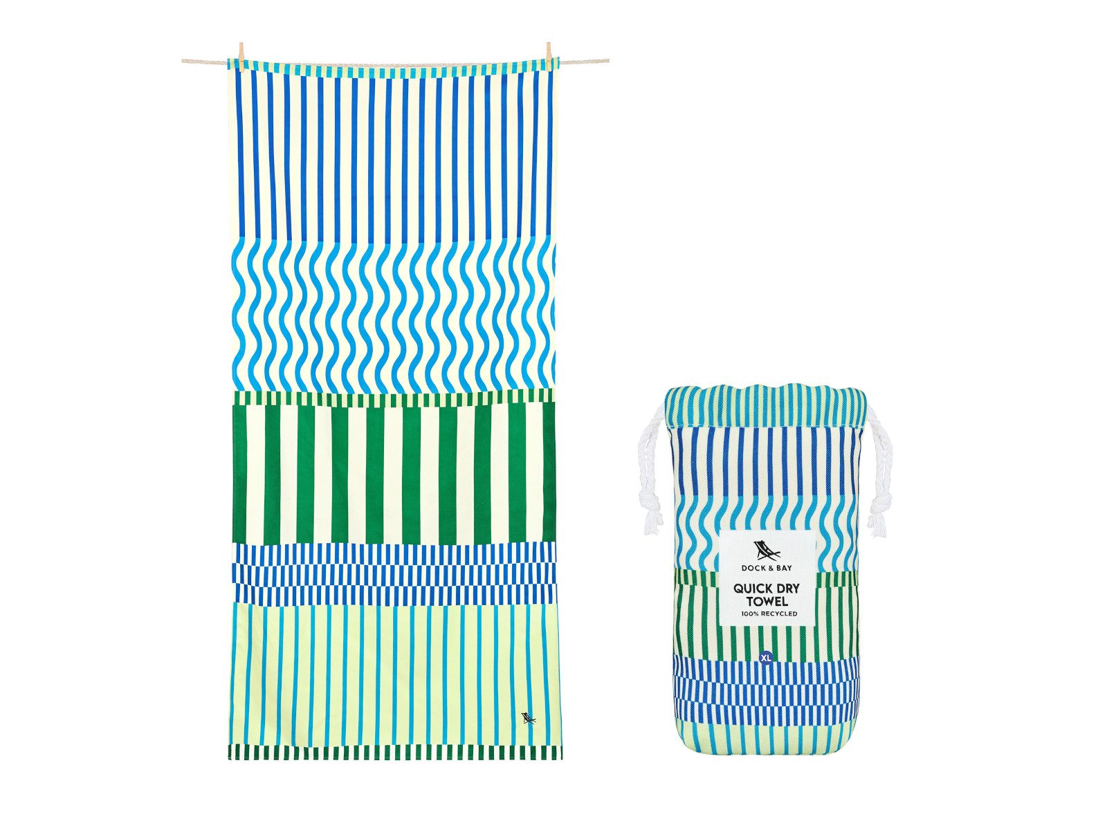 Das Dock & Bay Beach Towel XL „Blueberry Spritz“ bringt frische Farben und maximale Funktionalität an den Strand. Mit seinem lebendigen Streifendesign in Blau- und Grüntönen sorgt es für gute Laune – egal ob am Meer, Pool oder auf Reisen. Das großzügige XL-Format von 200 x 90 cm bietet viel Platz zum Liegen, Abtrocknen oder Teilen. Dank schnelltrocknender Mikrofaser ist es besonders saugfähig, leicht und sandabweisend – ideal für alle, die Komfort mit Stil verbinden wollen.