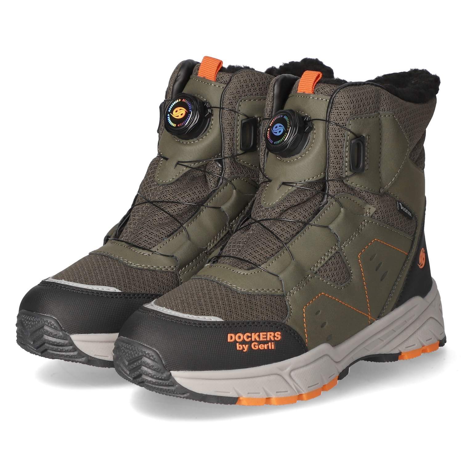 Sportlich, praktisch und kindgerecht: Die Dockers Schnürstiefeletten kombinieren ein wasserabweisendes Textil-Synthetik-Obermaterial mit wohligem Warmfutter. Der Schnellverschluss gewährleistet ein zügiges Fixieren des Schuhs, unterstützt von Anziehlaschen. Ein Wechselfußbett sorgt für individuelle Anpassung und einfache Pflege, die textile Decksohle erhöht den Tragekomfort. Stabilität geben die runde Spitze und verstärkte Zonen an Zehen und Ferse, während die flexible, rutschfeste Profilsohle für sicheren Tritt auf nassem Laub oder glatten Wegen sorgt. Reflektierende Details erhöhen die Sichtbarkeit, orangene Akzente setzen sportliche Kontraste zum satten Grün. Mit normal ausfallender Passform fügt sich der Schuh nahtlos in den Alltag von Kita bis Wochenendtour. Modetipp: Harmoniert besonders gut mit Fleecejacke, Denim und einer Mütze in Orange als Farbtouch.