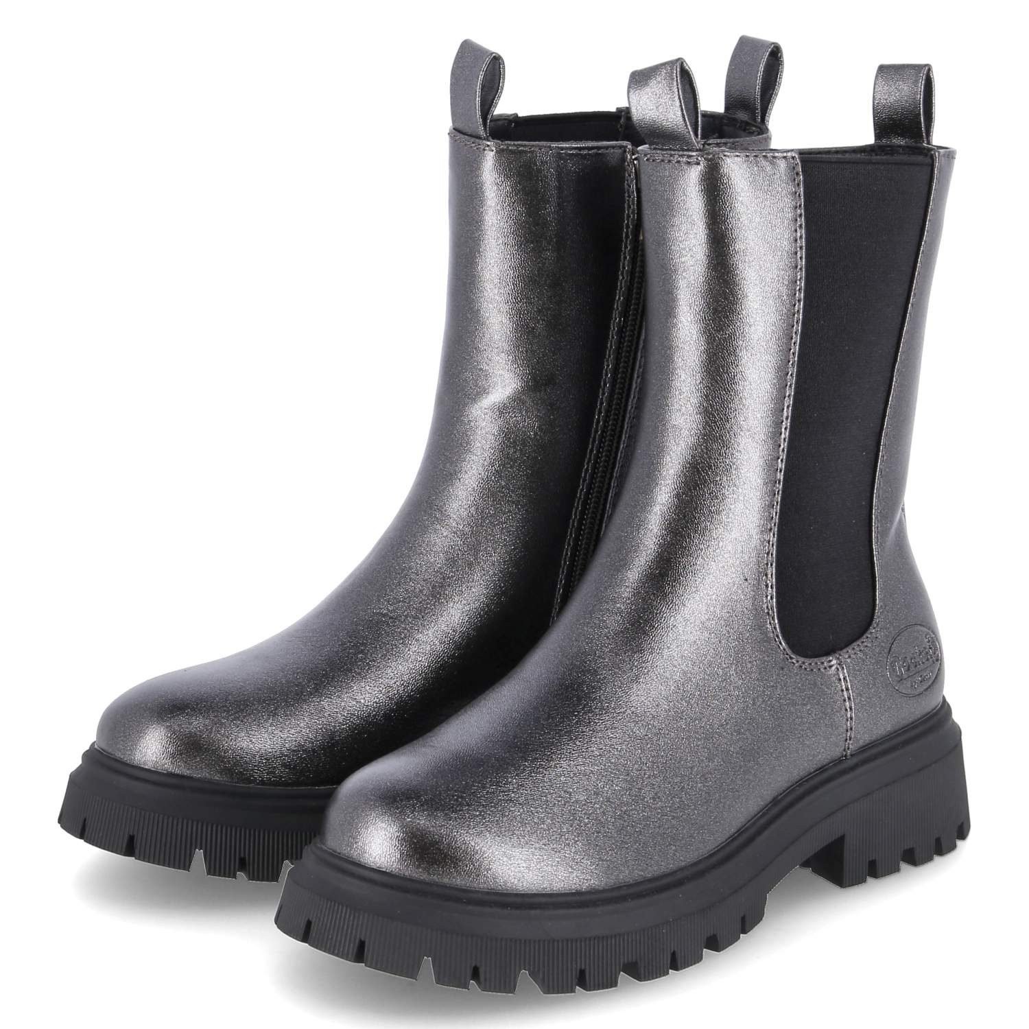 Die Dockers Mädchen Stiefeletten in grauem Kunstleder mit einem metallischen Schimmer bieten eine stilvolle und praktische Wahl für den Alltag. Der seitliche Elastikeinsatz in Kombination mit dem Reißverschluss ermöglicht ein einfaches An- und Ausziehen, während die Anziehlaschen zusätzlichen Komfort bieten. Das leichte, weiche Fleecefutter sorgt für wohlige Wärme, und die gepolsterte Decksohle bietet angenehmen Tragekomfort. Der verstärkte Fersenbereich gewährleistet Stabilität, und die rutschfeste, robuste Profilsohle sorgt für sicheren Halt auf verschiedenen Untergründen. Diese Chelsea Boots vereinen modischen Glanz mit Funktionalität, perfekt für die kalte Jahreszeit.