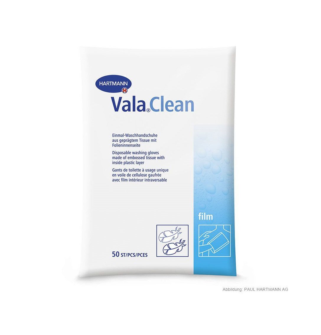 ValaClean film Einmal-Waschhandschuhe bieten eine hygienische und sanfte Reinigung durch weiches Spezial-Tissue mit geprägter Oberfläche für empfindliche Haut.