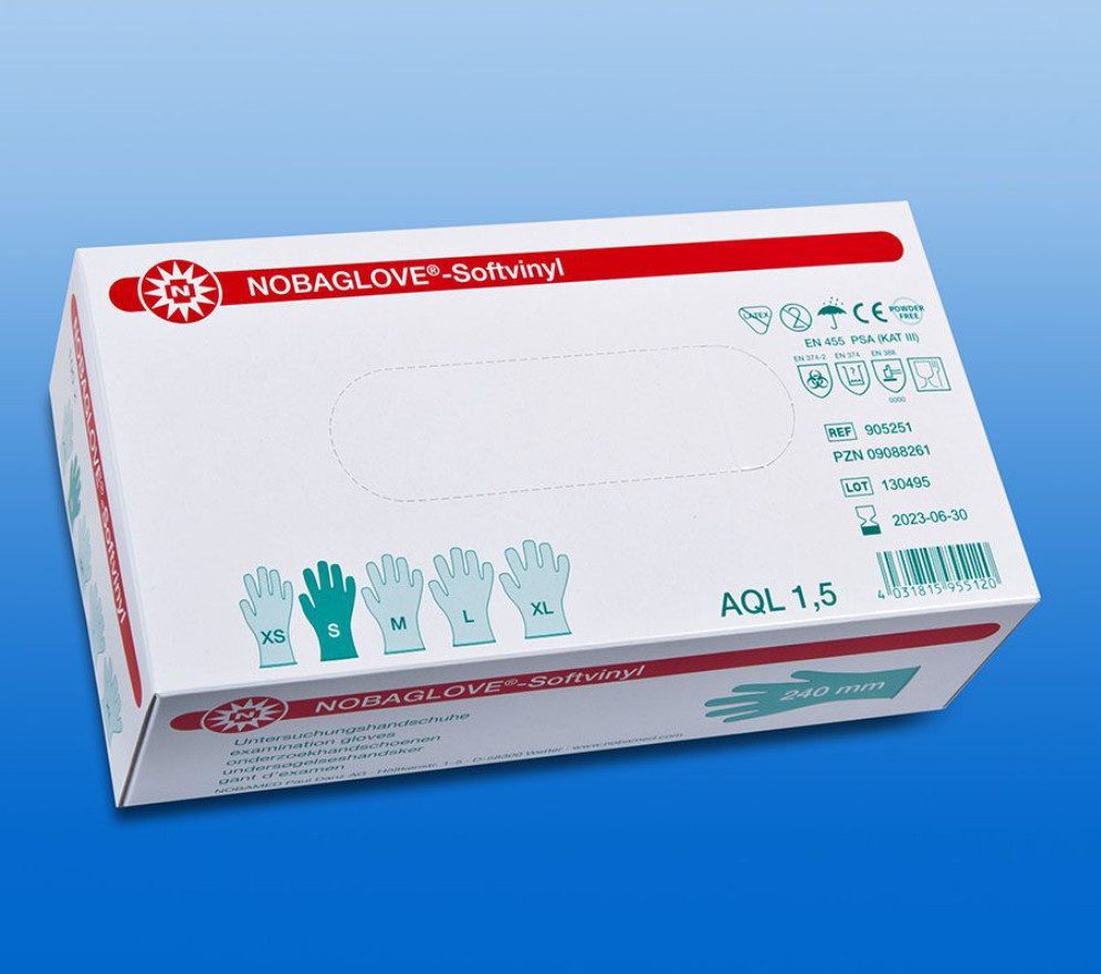 Die NOBAGLOVE® Softvinyl Untersuchungshandschuhe sind die ideale Lösung für alle Anwender, die auf der Suche nach einer latexfreien, hautfreundlichen und gleichzeitig zuverlässigen Alternative zu herkömmlichen Einmalhandschuhen sind. Hergestellt aus einem innovativen, modifizierten Vinylmaterial, bieten diese Handschuhe eine deutlich bessere Elastizität und ein angenehmeres Tragegefühl als klassische Vinylhandschuhe. Sie sind unsteril, puderfrei und erfüllen sämtliche Anforderungen der EN 455 Teile 1 bis 4, wodurch sie sich besonders für den medizinischen und pflegerischen Bereich eignen, in dem der Schutz vor Keimen und eine hygienische Arbeitsweise im Vordergrund stehen. Dank ihrer glatten Oberfläche und der beidhändigen Passform ermöglichen die Handschuhe ein leichtes An- und Ausziehen sowie eine gute Griffigkeit bei unterschiedlichen Tätigkeiten. Die weiche Materialbeschaffenheit sorgt selbst bei längerem Tragen für einen hohen Komfort und reduziert das Risiko von Hautreizungen oder allergischen Reaktionen. Durch den Verzicht auf Latex und Puder eignen sich die NOBAGLOVE® Softvinyl Handschuhe besonders für Personen mit sensibler Haut oder Latexunverträglichkeit. Sie sind in mehreren Größen erhältlich, wodurch eine individuelle Anpassung an die jeweilige Handform möglich ist. Die praktische Spenderbox mit 100 Stück pro Packung sorgt für eine hygienische und schnelle Entnahme in Arbeitsumgebungen mit hohem Handschuhverbrauch. Ob in der Arztpraxis, im Pflegeheim, in Laboren oder im kosmetischen Bereich – diese Handschuhe bieten einen zuverlässigen Basisschutz bei gleichzeitig hoher Anwenderfreundlichkeit. Ihr ausgewogenes Verhältnis von Schutz, Komfort und Flexibilität macht sie zu einem unverzichtbaren Bestandteil in jeder hygienisch anspruchsvollen Arbeitsumgebung. Die NOBAGLOVE® Softvinyl Handschuhe verbinden Sicherheit mit Komfort und sind damit ein professionelles Arbeitsmittel für den täglichen Gebrauch.