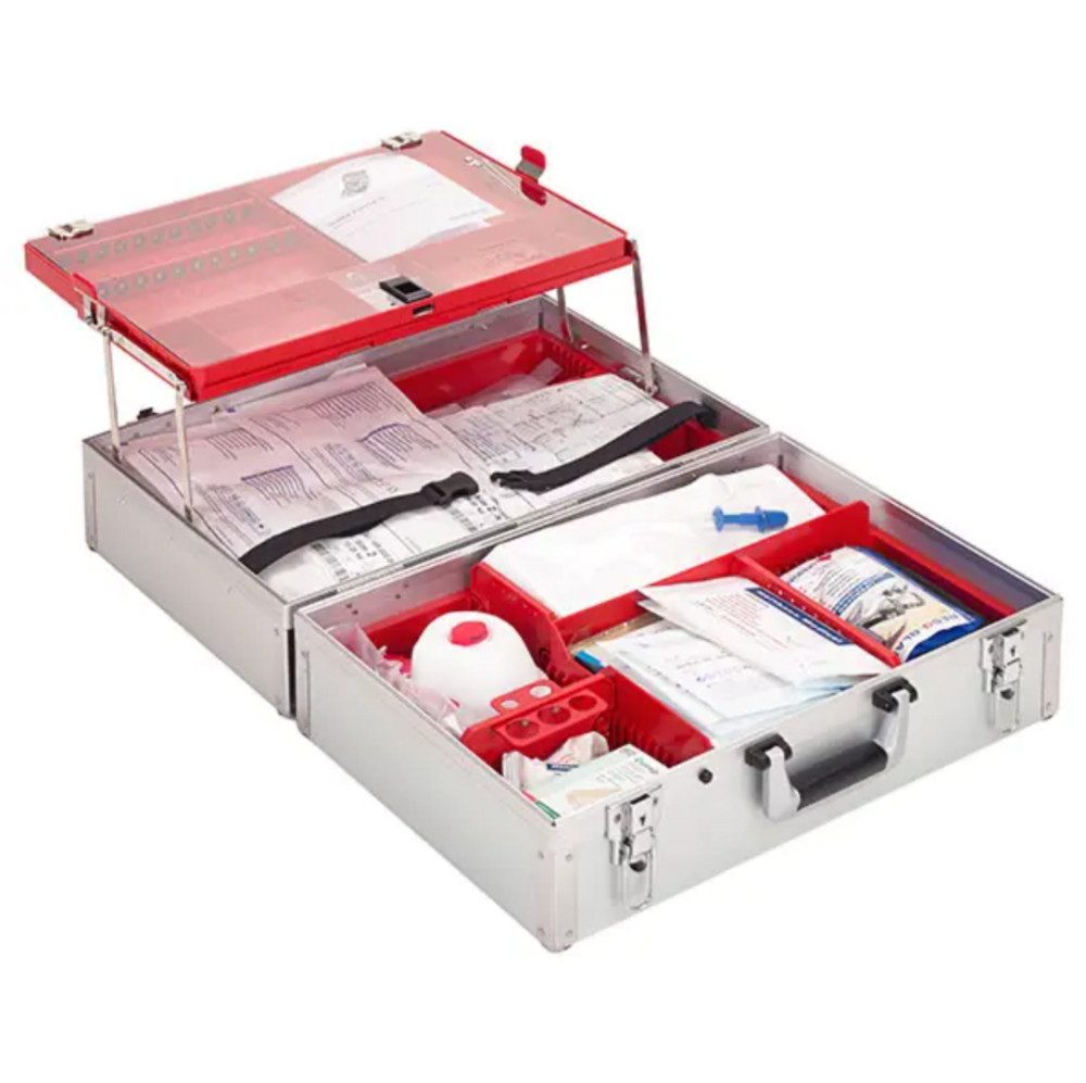 Lieferumfang | Ulmer Koffer III 1 Stück N4 8830 Silicone Line II, Silikonbeatmungsbeutel Typ Erw. mit Beatmungsmaske Gr. 5 1 Stück E5 0401-S Silikon-Beatmungsmaske Größe: 3 1 Stück E5 04 Peep-Ventil 1 Stück E5 20143 Peep-Ventil-Adapter 1 Stück E5 20140 Cold Blade LED ECO-Set 1 Stück I5 091LED Set Endotrachealtuben Ch. 14,16,18,20,24,28,30,32,34 1 Set N2 TTSET Einführungsmandrin Erwachsene 1 Stück N2 02443 Einführungsmandrin Kinder 1 Stück N2 02433 Guedeltuben-Set Gr. 000 - 5 1 Set I7 SET NasoClear Nasopharyngealtubus Ch. 26 1 Stück I7 038-95-006C NasoClear Nasopharyngealtubus Ch. 30 1 Stück I7 038-95-007C Magillzange für Erwachsene 1 Stück I5 030 Universalklemme, grün 1 Stück H7 1800 Peanklemme 14,5 cm gerade 1 Stück I5 011 Sauerstoffflasche 2,0 l 1 Stück E5 500140 Druckminderer regelbar 0-15 l/min 1 Stück E5 3000 Spanngurte für O2-Flasche 1 Paar N4 15141 VACQ-Breezer Handabsaugpumpe 1 Set N2 2300-P Absaugkatheter Ch. 12 3 Stück F5 0105 Absaugkatheter Ch. 10 3 Stück F5 0101 Absaugkatheter Ch. 06 3 Stück F5 0103 Pupillenleuchte 1 Stück B6 1003 Pressure Man Blutdruckmanometer 1 Stück E3 03-68 Blutdruckmanschette für Erwachsene 1 Stück E3 1222 Blutdruckmanschette für Kinder 1 Stück E3 1250 Stethoskop Doublehead, schwarz 1 Stück G5 005 Reflexhammer Typ Buck 1 Stück I5 840 Rettungsdecke gold/silber 160 x 210 cm 1 Stück H1 16902 Infusionsgerät 1 Stück I4 4062981 Infusionsdruck-Manschette 1 Stück E5 00301 Alkoholtupfer 10 Stück G6 02 Venenstauer 1 Stück G2 1001 Vasofix Braunüle Nr. 14 2 Stück I4 0414 Vasofix Braunüle Nr. 18 2 Stück I4 0418 Vasofix Braunüle Nr. 20 2 Stück I4 0420 Kanüle Nr. 1 10 Stück L1 0201 Kanüle Nr. 12 10 Stück L1 0212 Spritze 2 ml 5 Stück I3 0201 Spritze 5 ml 5 Stück I3 0202 Spritze 10 ml 5 Stück I3 0203 Spritze 20 ml 2 Stück I3 0204 Chir. Pinzette 14 cm 1 Stück I5 014 Chir. Schere 14,5 cm gerade sp/st 1 Stück I5 024 M-Plast 2,5 cm x 5 m 1 Stück J8 700942 Sterillium pure, 100 ml 1 Stück E1 981683 Handschuhe Gr. L 8 Stück H9 0303 Softhand OP-Handschuhe Latex, Gr. 7,5 1 Paar H9 05075 Softhand OP-Handschuhe Latex, Gr. 8,5 1 Paar H9 05085 Mund-Nasenschutzmasken > 3-lagig 4 Stück H7 5099150 Schutzbrille mit Seitenschutz 1 Stück H7 4308 Einmalskalpell 1 Stück I1 0922 |