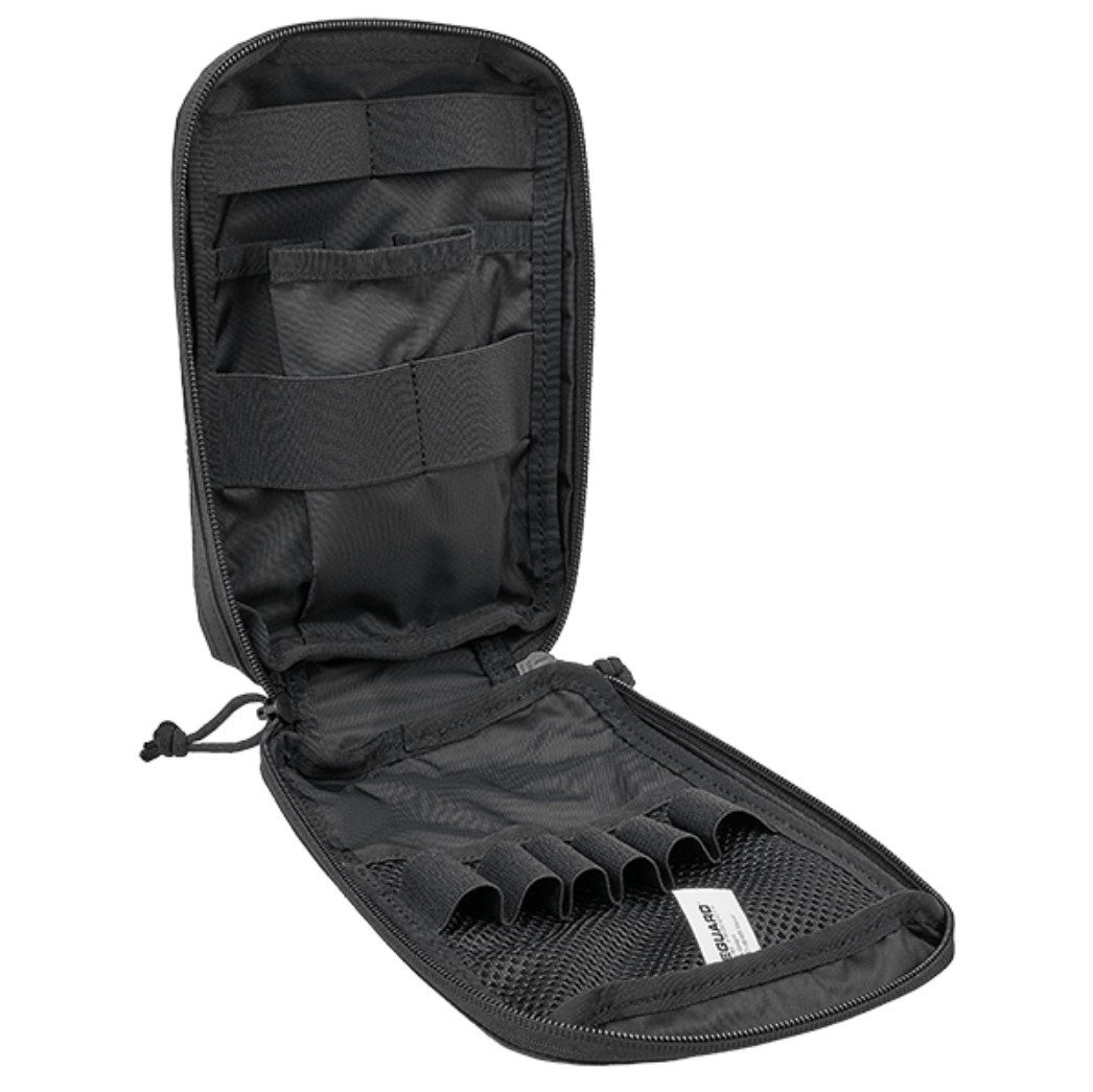 Im Inneren sorgen elastische Schlaufen und Halterungen für eine geordnete und griffbereite Aufbewahrung von Tourniquets, Verbänden und anderen Notfallartikeln.
