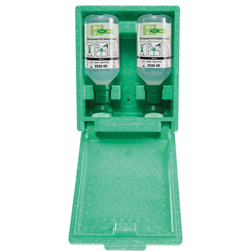 Staubgeschützte Wandbox mit zwei 500-ml-Flaschen sorgt für hygienische Augenspülung auch an staubigen Arbeitsplätzen wie Werkstätten oder Baustellen.