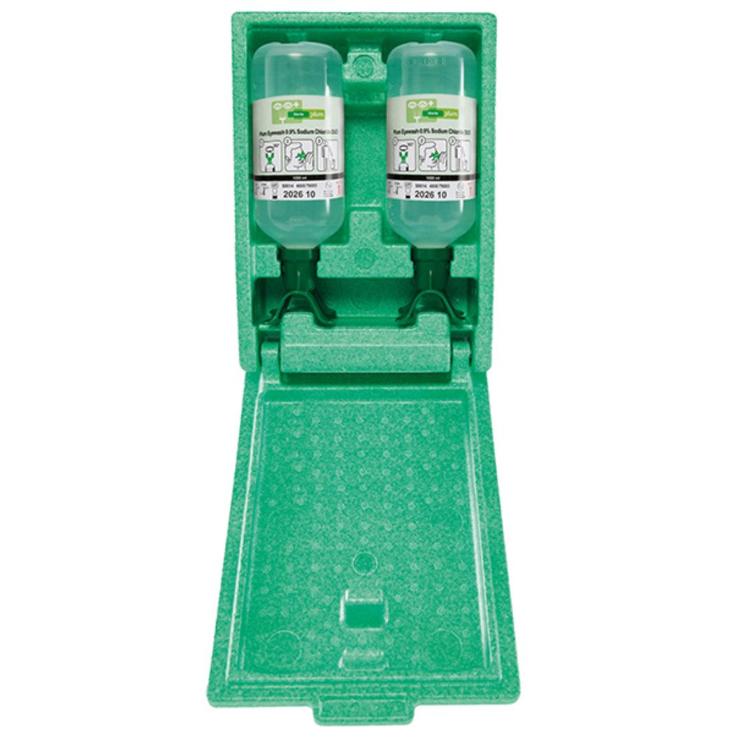 Zwei 1000-ml-Flaschen mit steriler Natriumchlorid-Lösung ermöglichen die gleichzeitige Spülung beider Augen bei mechanischen Reizungen oder Fremdkörperkontakt.