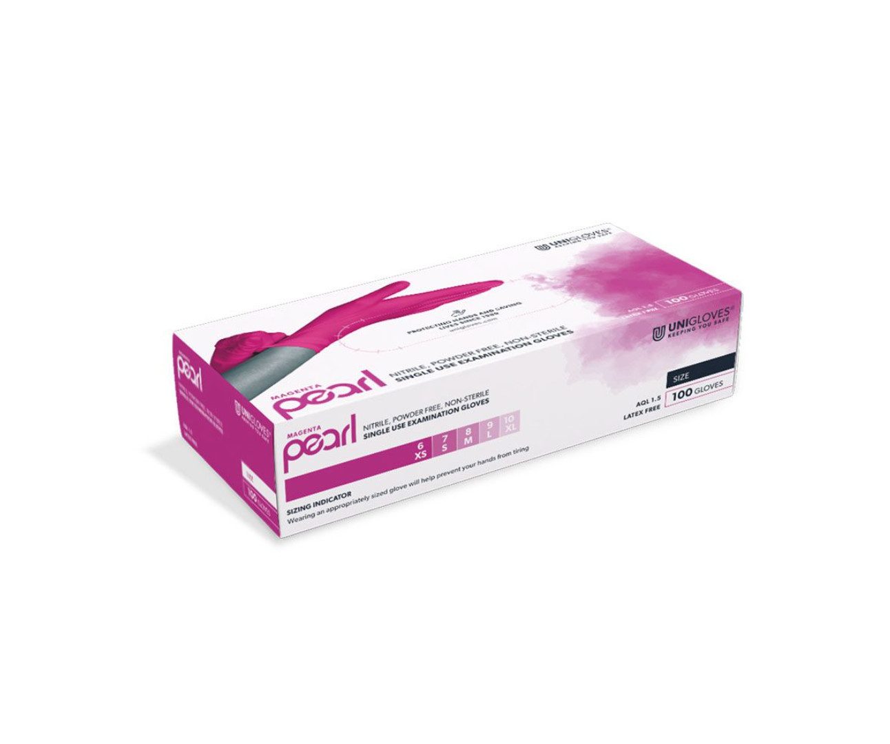 Die Unigloves MAGENTA PEARL® Nitril-Untersuchungshandschuhe sind die ideale Wahl für professionelle Anwender, die Wert auf Hygiene, Sicherheit und Komfort legen. Hergestellt aus hochwertigem Nitril und vollständig latexfrei, bieten sie eine hervorragende Alternative für Menschen mit Latexallergien. Die auffällige Magenta-Färbung sorgt nicht nur für einen modernen und professionellen Look, sondern erleichtert auch die Sichtbarkeit und Differenzierung in Arbeitsumgebungen wie medizinischen Einrichtungen, Kosmetikstudios, Laboren oder in der Lebensmittelverarbeitung. Die Handschuhe sind beidhändig tragbar, was das Anlegen vereinfacht und unnötige Sortierarbeit verhindert. Durch ihre exakte Passform schmiegen sie sich angenehm an die Hand an und gewährleisten dank mikrogerauter Fingerspitzen einen sicheren Griff, selbst bei feuchten oder glatten Oberflächen. Sie bieten zuverlässigen Schutz vor Bakterien, Pilzen und Viren und erfüllen die Anforderungen der Normen EN 455 und EN 374, wodurch sie sowohl im medizinischen als auch im hygienischen und industriellen Bereich einsetzbar sind. Das reißfeste, zugleich elastische Material ermöglicht ein komfortables Tragen über längere Zeiträume, ohne die Bewegungsfreiheit einzuschränken oder die Haut zu irritieren. Ob bei Pflegehandlungen, Reinigungsarbeiten, Laboranalysen oder bei kosmetischen Behandlungen – die MAGENTA PEARL® Nitrilhandschuhe garantieren höchste Standards an Sicherheit und Sauberkeit. Sie sind in den Größen XS bis XL erhältlich und passen sich durch ihre hohe Elastizität individuell der Handform an. Verpackt zu 100 Stück pro Box, lassen sie sich effizient und hygienisch entnehmen. Wer zuverlässige Einmalhandschuhe mit Stil und professioneller Schutzwirkung sucht, trifft mit dem MAGENTA PEARL® von Unigloves eine durchdachte und hochwertige Wahl für den täglichen Einsatz.