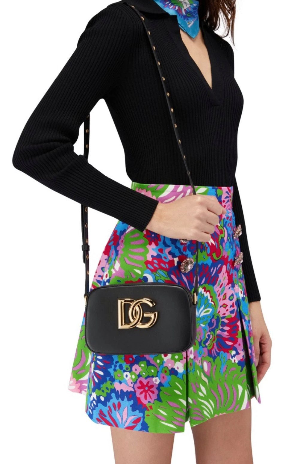 Diese exklusive Umhängetasche von Dolce & Gabbana ist ein echtes Statement-Accessoire für stilbewusste Frauen. Gefertigt aus hochwertigem Kalbsleder in klassischem Schwarz überzeugt sie mit ihrer schlichten Eleganz und dem markanten DG-Logo in glänzendem Gold. Die Tasche lässt sich dank des verstellbaren Riemens bequem über der Schulter oder crossbody tragen. Im Inneren bietet sie ein kompaktes, aber funktionales Fach mit zusätzlichem Reißverschlussfach für kleine Essentials. Das goldene Metall-Logo und die edlen Beschläge unterstreichen den luxuriösen Charakter der Tasche und machen sie zum perfekten Begleiter – ob tagsüber in der City oder abends zum Ausgehen. Made in Italy.