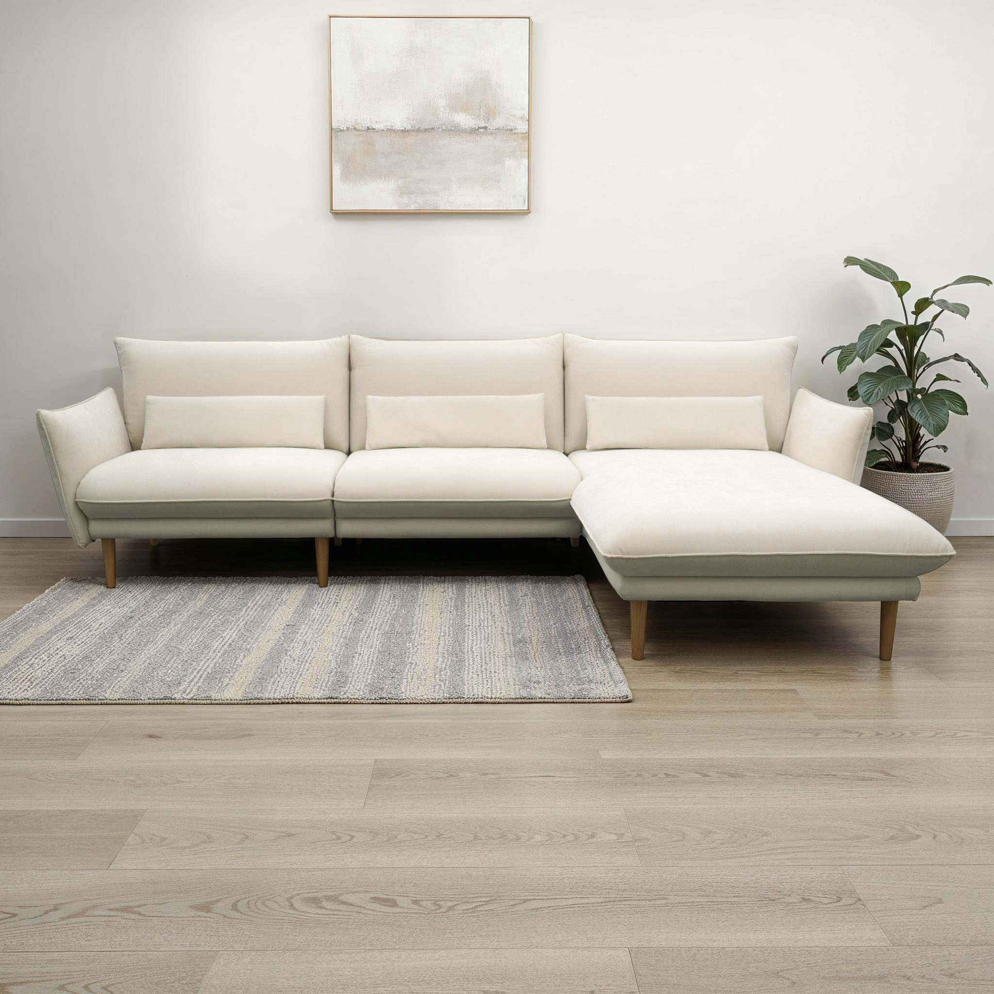Durch die hochwertige Wellenunterfederung wird die Sitzfläche des Ecksofas »Leuven modern mit schmalen Armlehnen, Breite 282 cm, L-Form« von DOMO collection gut gefedert und bleibt dauerhaft elastisch. Ein weiterer Vorteil sind die dekorativen Nierenkissen, die das Sitzen noch komfortabler machen. Von vorne betrachtet ist der Longchair nach rechts ausgerichtet. Die individuelle Maserung macht die eichefarbenen Füße aus Massivholz unverwechselbar. Dieses Modell wurde von Hand gefertigt.
