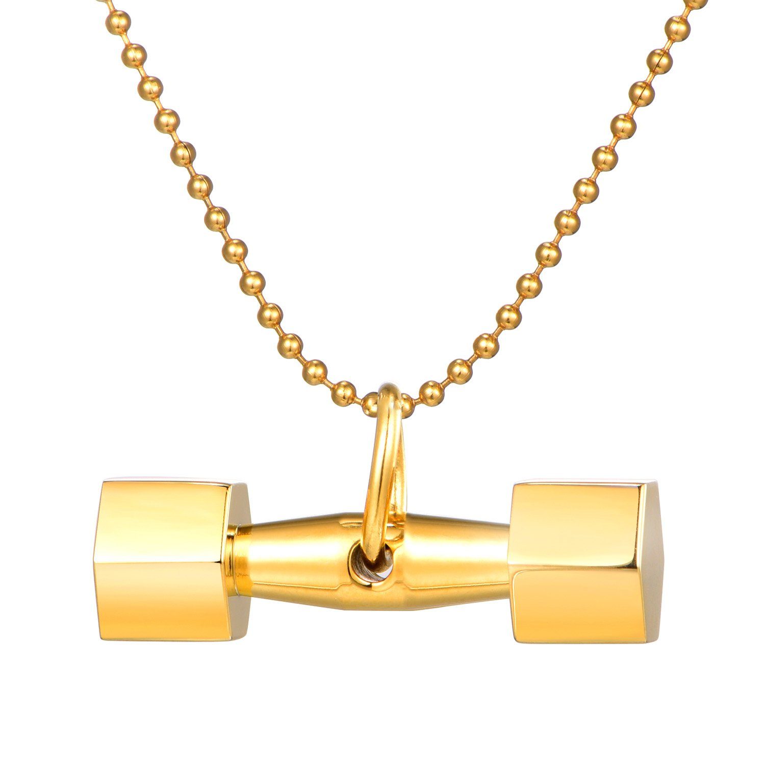Sportliche Edelstahlhalskette in silber-, goldfarben oder schwarz mit Hantel-Anhänger
