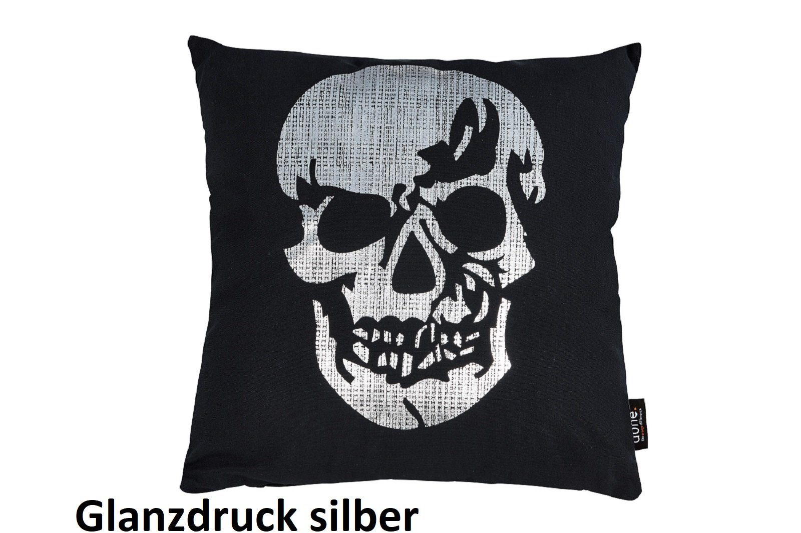 Dieses moderne coole Kissen von Done überzeugt durch den großen Totenkopf. Sie haben die Wahl zwischen Strassteinen in schwarz oder silber oder Sie können auch einen Gold- oder Silberdruck wählen. Все Kissen lassen sich gut kombinieren. Sie erhalten jeden Bezug mit einem Füllkissen in der entsprechenden Größe.