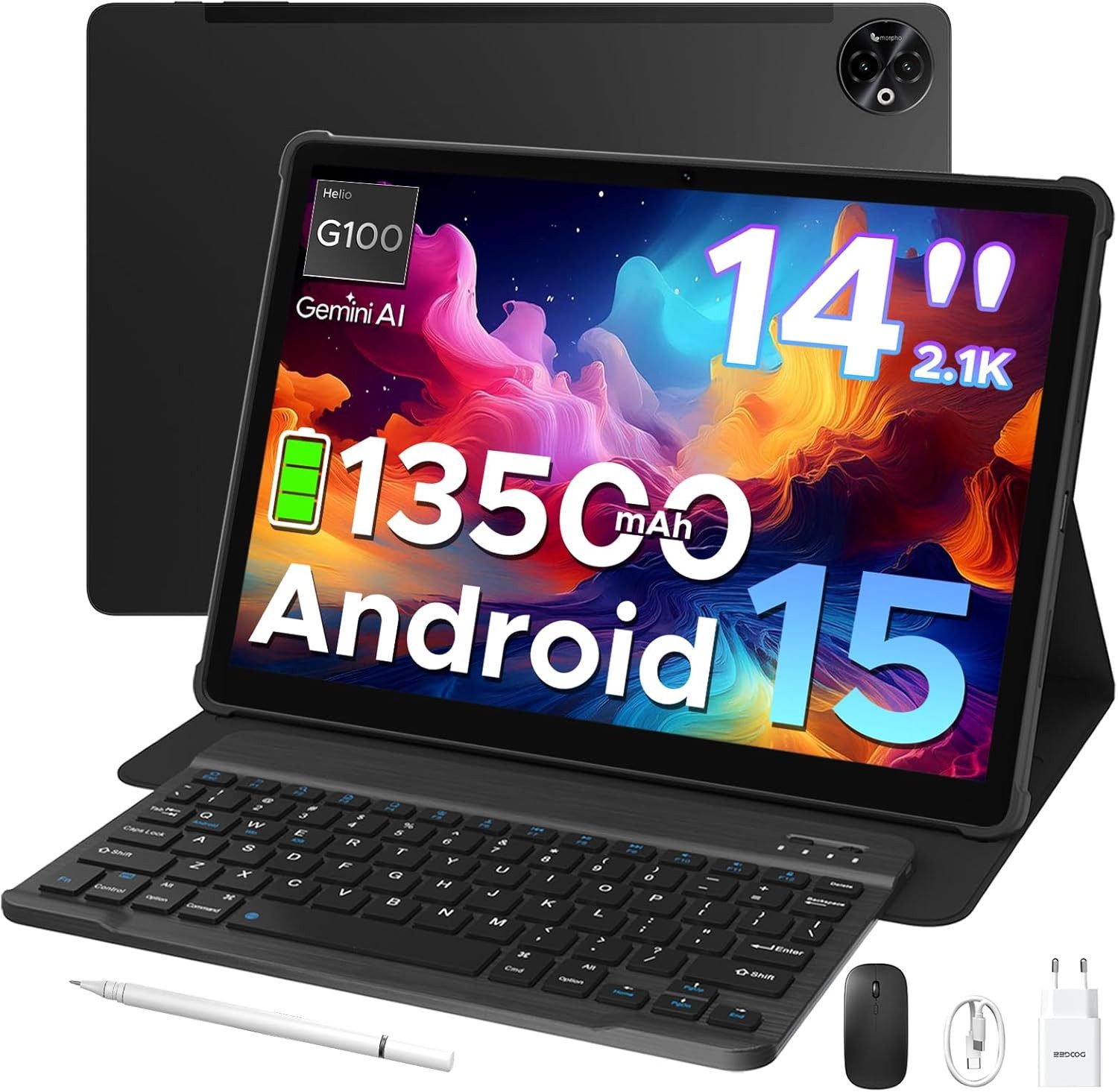 Android 15 Tablet 14 Zoll Gemini AI 13500mAh Helio G100 32GB RAM+256GB Tablet mit SIM Card Slot Octa Core Tablets mit Tastatur, Maus, Stift, Hülle, Schutzfolie Dual 4G LTE + 5G WiFi