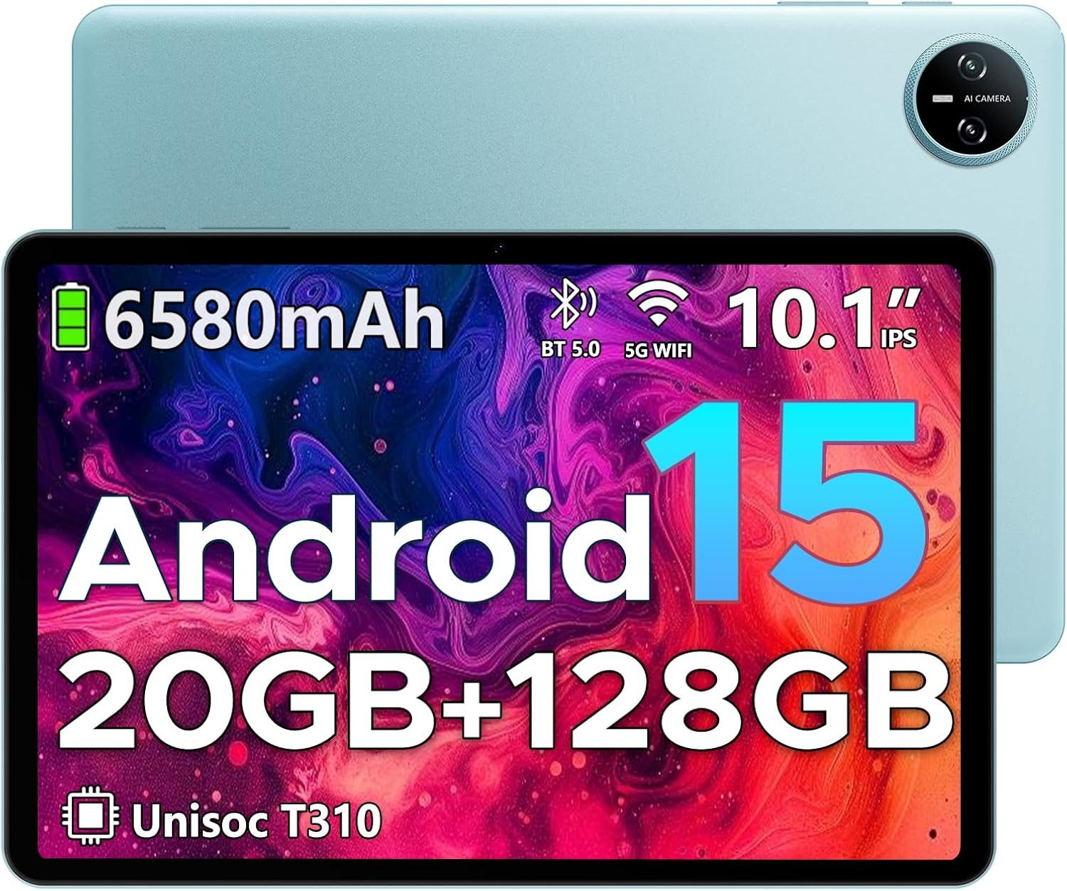 Android 15 Tablet 10 Zoll, 20GB RAM+128GB ROM(2TB TF) Android Tablet, 10,1" HD IPS Display Gaming Tablet, 6580mAh, Unisoc T310, 8MP AI Camera, 5 WiFi/GMS/Face ID/BT 5.0/3,5mm Jack