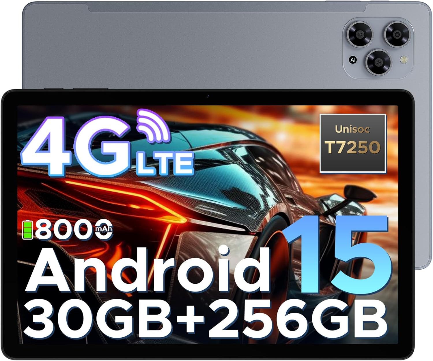 Android 15 Tablet 11 Zoll, 30GB RAM + 256GB ROM Tablet mit SIM-Karten-Slot, 8000mAh Akku, Gemini KI, Unisoc T7250 Octa-Core, Widevine L1, Netflix, 4G LTE, 3,5 mm Kopfhöreranschluss / 5G WLAN