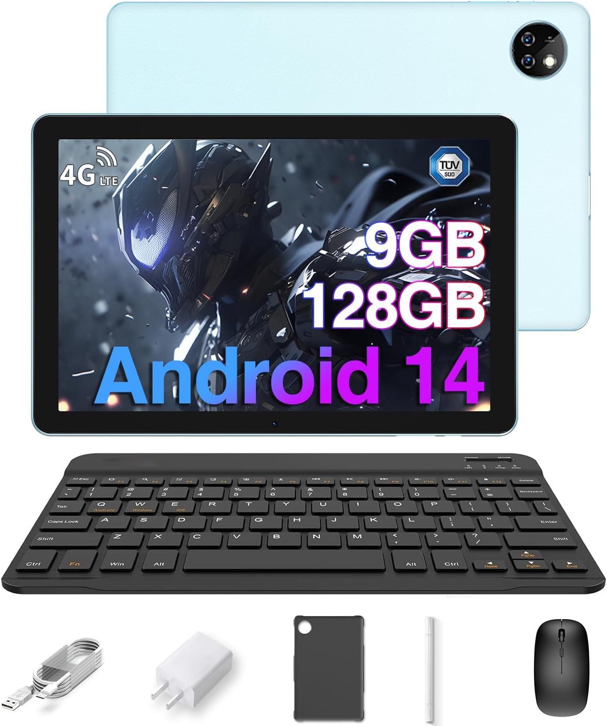 Tablet 10 Zoll, Android 14 Tablet mit Tastatur, 9 GB RAM+128 GB ROM/1 TB Erweiterung, HD Touchscreen, Tablet PC 8000 mAh | Widevine L1 | WiFi | GPS | BT 5.0 | LTE | OTG, Tablet mit Stift