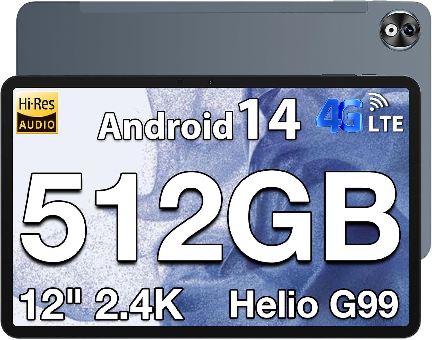 Tablet 12 Zoll, Android 14 Tablet, Helio G99 20GB RAM+512GB ROM(2TB TF) Tablet PC, 2.4K Gaming Tablet, 10800mAh Akku Tablet mit 16MP+8MP 4G Dual SIM/ 5G WiFi/GPS/Widevine L1