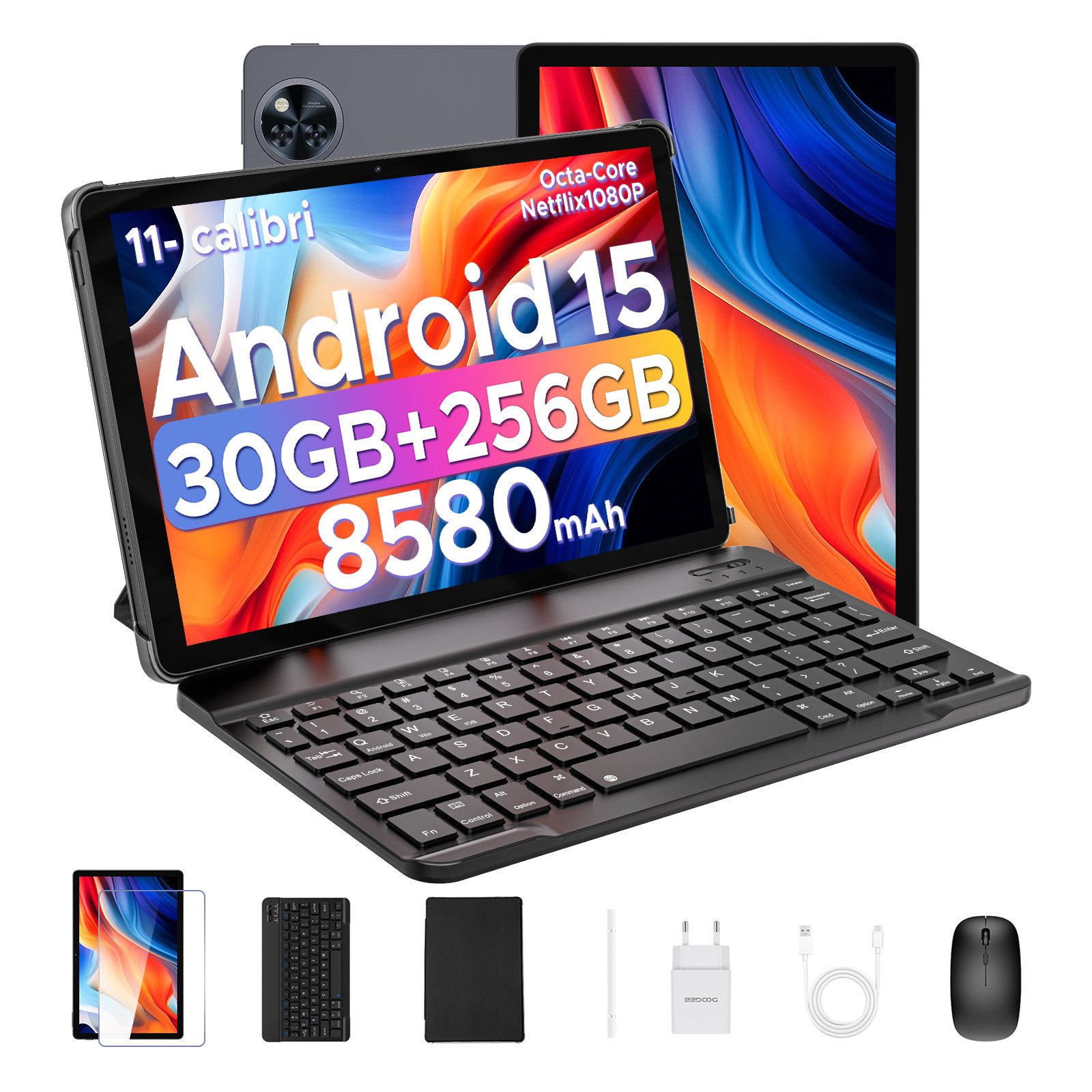 Lieferumfang | 1 x Tablette 1 x Ladegerät 1 x Typ-C USB-Kabel 1 x Werkzeug zur Kartenentnahme 1 x Handbuch 1 x Schutzfolie aus gehärtetem Glas 1 x Bluetooth-Tastatur 1 x Bluetooth-Maus 1 x Berührungsstift 1 x Business-Tablet-Schutzhülle |