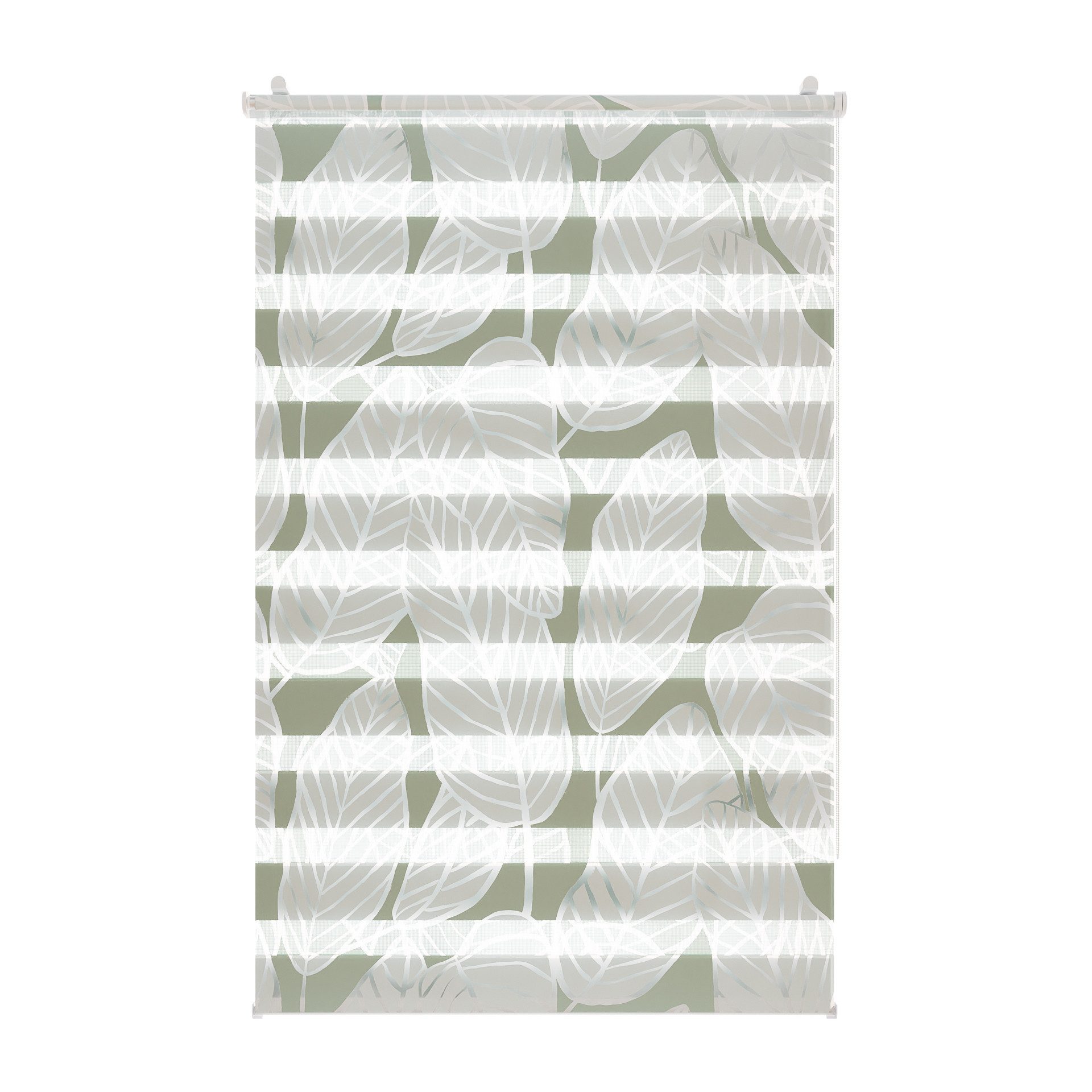 Mit absoluten Trendfarben wurde das Motiv Bananenblatt in Grün und hellem Blau gestaltet. Die Künstlerin Julia Schumacher hebt die einzelnen abgebildeten Bananenblätter durch die weißen Konturen ab und setzt so das ganze Motiv in Szene. Eine Besonderheit bei diesem Doppelrollo mit Motiv ist der hochwertige Digitaldruck, der das Motiv fotorealistisch und damit besonders edel wirken lässt. Das Duo Rollo wird in Deutschland gefertigt und bedruckt, was somit ein weiteres Qualitätsmerkmal ist. Das Klemmfix Duo Rollo ist einseitig bedruckt, allerdings ist das Motiv durch die doppelten Stoffbahnen von innen und außen am Fenster oder der Tür sichtbar. Das Duo Rollo ist ein innovatives Sonnenschutzsystem für Licht- und Sichtschutz und integriert die moderne Fensterdekoration mit hochwertigen Materialien. Durch die transparenten parallel gegeneinander laufenden Stoffbahnen kann das Licht ganz einfach und nach Bedarf reguliert werden. So entstehen wunderschöne Licht- und Schattenspiele. Die Position des Rollos am Fenster kann mithilfe des Kettenzugs punktgenau eingestellt werden. So gelangt entweder mehr Tageslicht durch die transparenten Stoffbahnen oder die blickdichten Streifen schützen vor neugierigen Blicken und starker Sonneneinstrahlung. Diese Funktion kann in jeder beliebigen Höhe genutzt werden, da sich der Stoff wie bei einem herkömmlichen Seitenzugrollo komplett auf- und abrollen lässt. Auch die Montage des Duo Rollos ist ein echtes Highlight. Diese erfolgt schnell, einfach und kinderleicht dank der im Lieferumfang enthaltenen verstellbaren Klemmträger. Diese werden zusammen mit der Montageschiene der Doppelrollos auf den Fensterflügel geklemmt. Mit der Klemmträgermontage muss weder gebohrt, noch geschraubt werden. Alternativ ist die Montage zum Schrauben an Wand, Decke oder Fensterlaibung möglich, die entsprechenden Clips sind im Lieferumfang enthalten (aber keine Schrauben und Dübel).