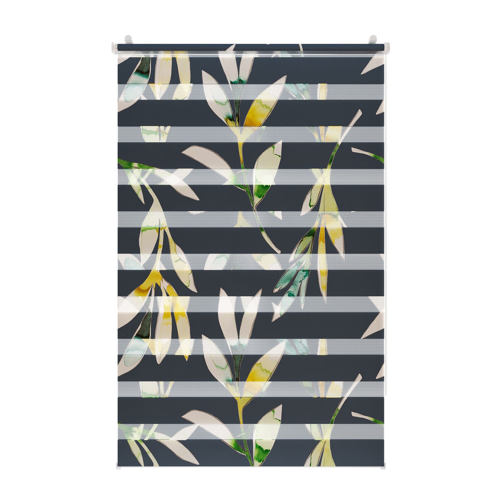 Ein eher dunkles Motiv von Julia Schumacher nennt sich Moody Branch. Der Titel des Designs lässt sich auf die verschwommenen bunt ausgefüllten Blattzweige auf dem dunkelblauen Hintergrund zurückführen. Inspiriert wird die Künstlerin Julia von den vielen Facetten der Natur, welche sie unter anderem auf ihren Reise entdeckt. Eine Besonderheit bei diesem Doppelrollo mit Motiv ist der hochwertige Digitaldruck, der das Motiv fotorealistisch und damit besonders edel wirken lässt. Das Duo Rollo wird in Deutschland gefertigt und bedruckt, was somit ein weiteres Qualitätsmerkmal ist. Das Klemmfix Duo Rollo ist einseitig bedruckt, allerdings ist das Motiv durch die doppelten Stoffbahnen von innen und außen am Fenster oder der Tür sichtbar. Das Duo Rollo ist ein innovatives Sonnenschutzsystem für Licht- und Sichtschutz und integriert die moderne Fensterdekoration mit hochwertigen Materialien. Durch die transparenten parallel gegeneinander laufenden Stoffbahnen kann das Licht ganz einfach und nach Bedarf reguliert werden. So entstehen wunderschöne Licht- und Schattenspiele. Die Position des Rollos am Fenster kann mithilfe des Kettenzugs punktgenau eingestellt werden. So gelangt entweder mehr Tageslicht durch die transparenten Stoffbahnen oder die blickdichten Streifen schützen vor neugierigen Blicken und starker Sonneneinstrahlung. Diese Funktion kann in jeder beliebigen Höhe genutzt werden, da sich der Stoff wie bei einem herkömmlichen Seitenzugrollo komplett auf- und abrollen lässt. Auch die Montage des Duo Rollos ist ein echtes Highlight. Diese erfolgt schnell, einfach und kinderleicht dank der im Lieferumfang enthaltenen verstellbaren Klemmträger. Diese werden zusammen mit der Montageschiene der Doppelrollos auf den Fensterflügel geklemmt. Mit der Klemmträgermontage muss weder gebohrt, noch geschraubt werden. Alternativ ist die Montage zum Schrauben an Wand, Decke oder Fensterlaibung möglich, die entsprechenden Clips sind im Lieferumfang enthalten (aber keine Schrauben und Dübel).
