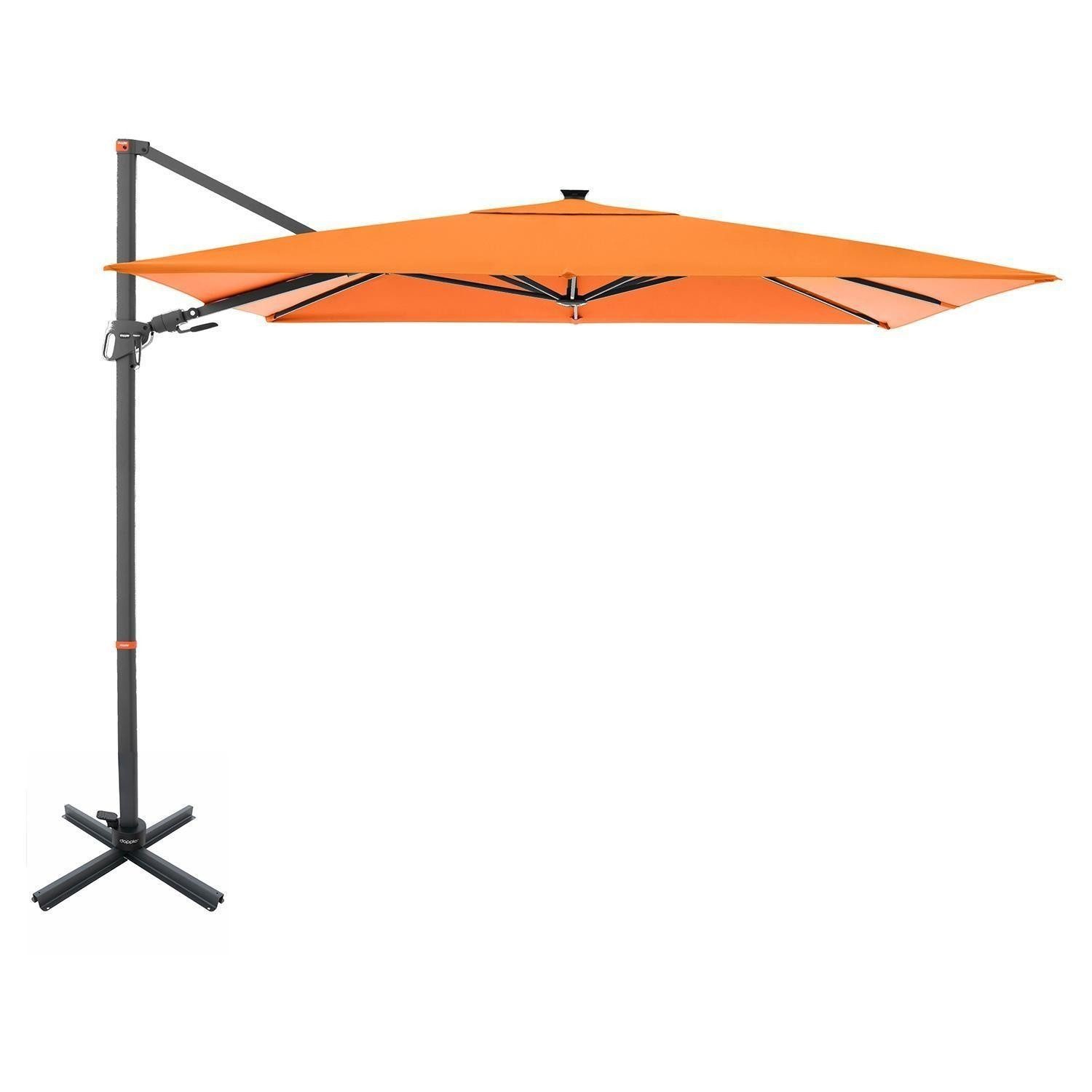 Lieferumfang | 1 Ampel-Sonnenschirm mit Standkreuz und LED-Beleuchtung mit Solar-Panel. Bodenplatten sind nicht enthalten |