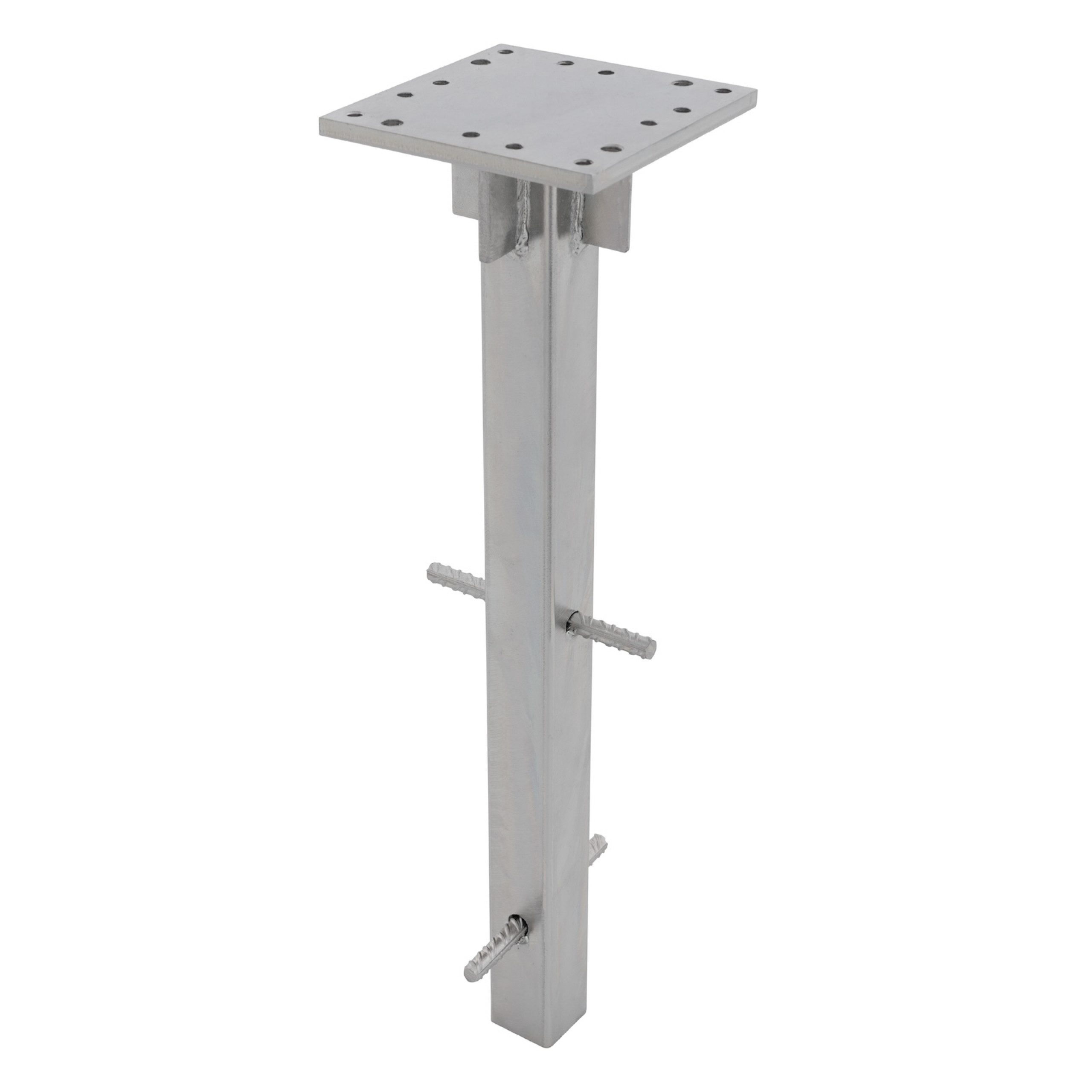 Der massive, verzinkte und pulverbeschichtete Bodenanker wird bodeneben in den Untergrund einbetoniert.