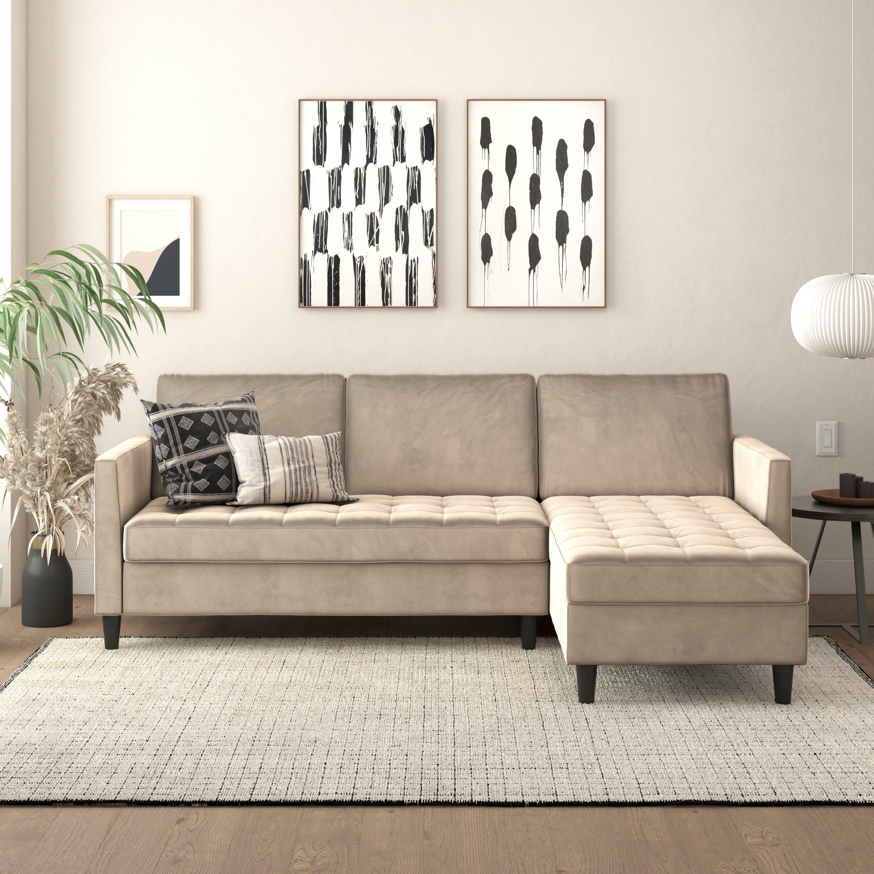 Eine dauerhaft elastische und komfortable Sitzfläche — das bekommst du bei diesem Ecksofa »Presley, L-Form,« von Dorel Home, das mit einer hochwertigen Wellenunterfederung ausgestattet ist. Zudem musst du für Zeitschriften oder die Fernbedienung nicht extra aufstehen, denn es hat Stauraum, auf dem du alles, was du für einen entspannten Abend brauchst, ablegen kannst. Das Produkt ist manuell verstellbar, sodass du die Ausrichtung mit einer einfachen Bewegung anpassen kannst. Die Recamiere kann sowohl links als auch rechts montiert werden. Belastbar ist dein neues Möbelstück bis zu 135 Kilogramm. Der Bezug besteht aus Samtvelours — einem Material mit angenehmen, weichen Griff.