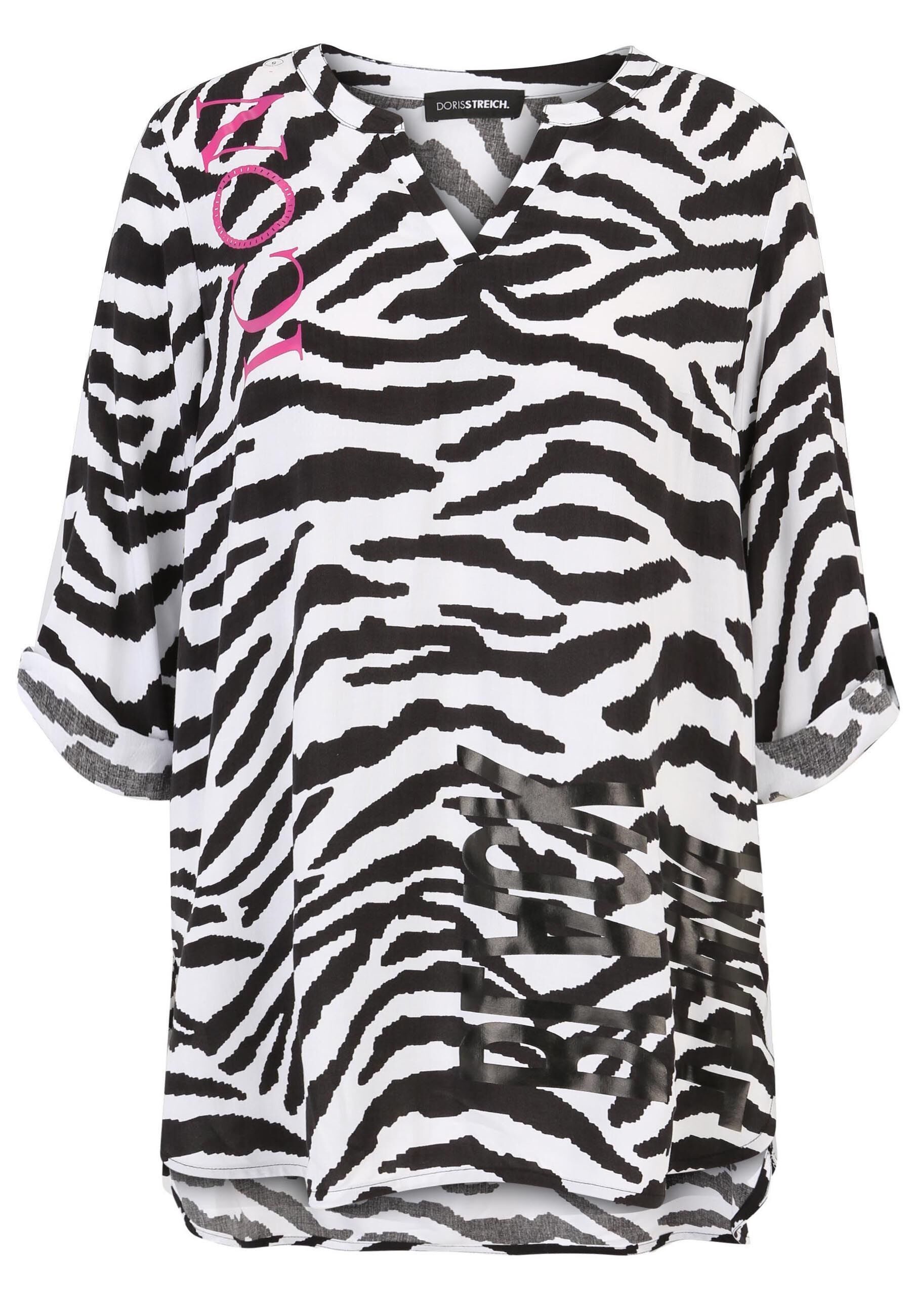 Die Schlupfbluse von Doris Streich besticht durch ihren cleanen Grafik-Print. Das weiche Viskose-Material, die fließende Passform mit Seitenschlitzen umspielt Ihre Figur perfekt. Die 3/4-Ärmel lässen sich verstellen, ob hochgerafft oder hochgekrempelt, mit den Laschen am Ärmel zu fixieren. Ein dekoratives Wording-Motiv in Pink und Schwarz unterstreichen den lässigen Look dieses High-Low-Styles mit verlängerter Rückenpartie. Alloverprint, nicht platziert - jedes Teil ein Unikat.