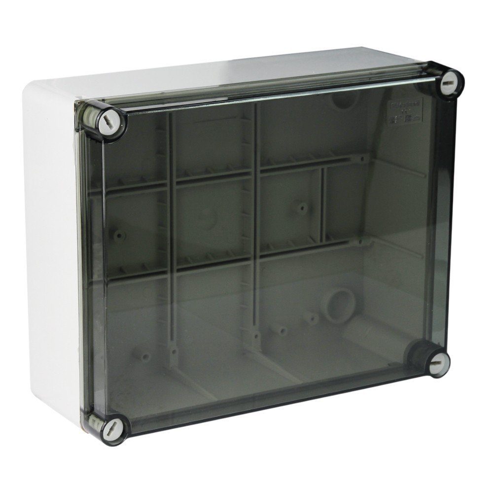 Die hermetische Aufputzdose hat einen getönten, transparenten Deckel und Boden in grau. Das Produkt zeichnet sich durch einen hohen Schutzgrad gegen mechanische Einwirkungen aus und hat die Schutzart IP66. Die Box wird für Innen- und geschützte Außeninstallationen verwendet. Aufputzdose mit den Außenmaßen 245x190x90 mm und den Innenmaßen 240x190x90 mm.