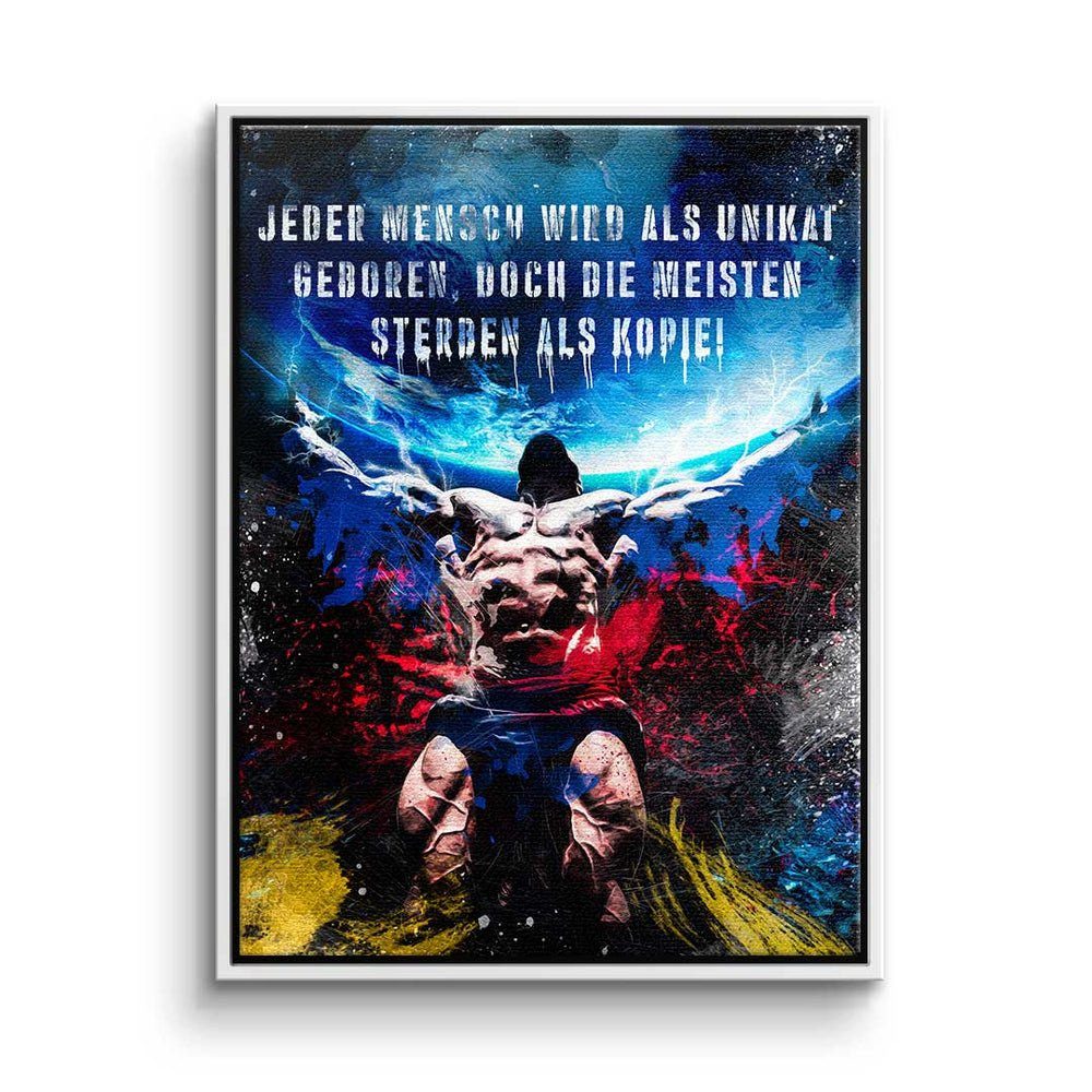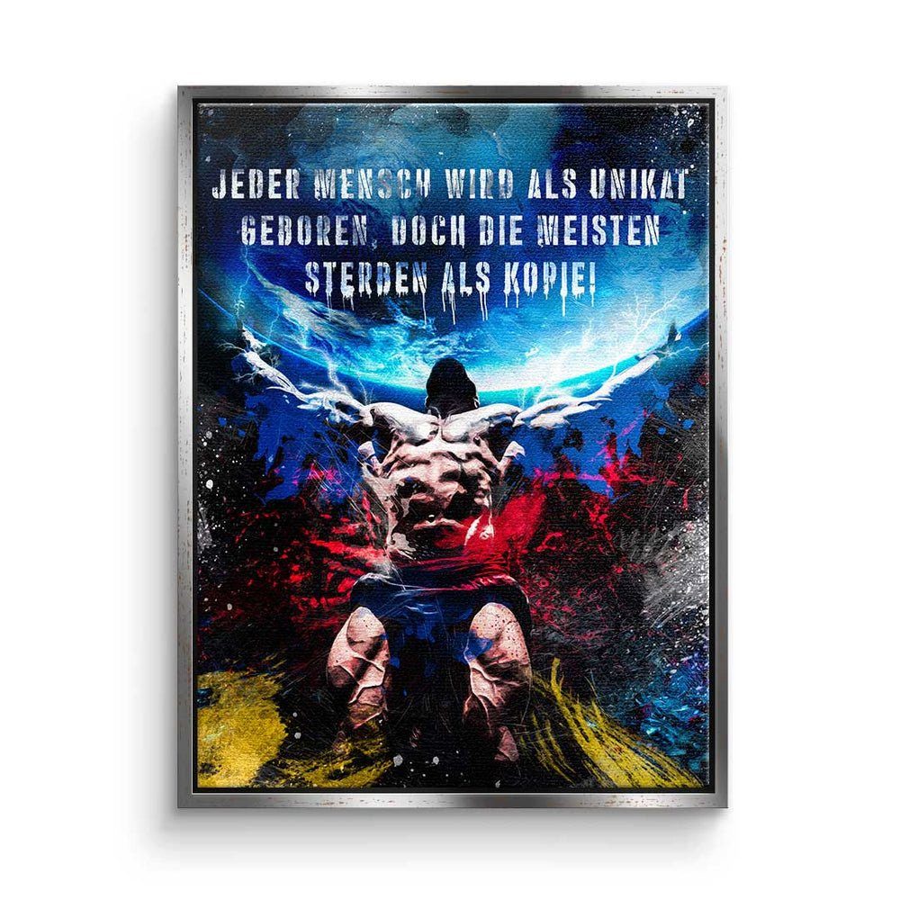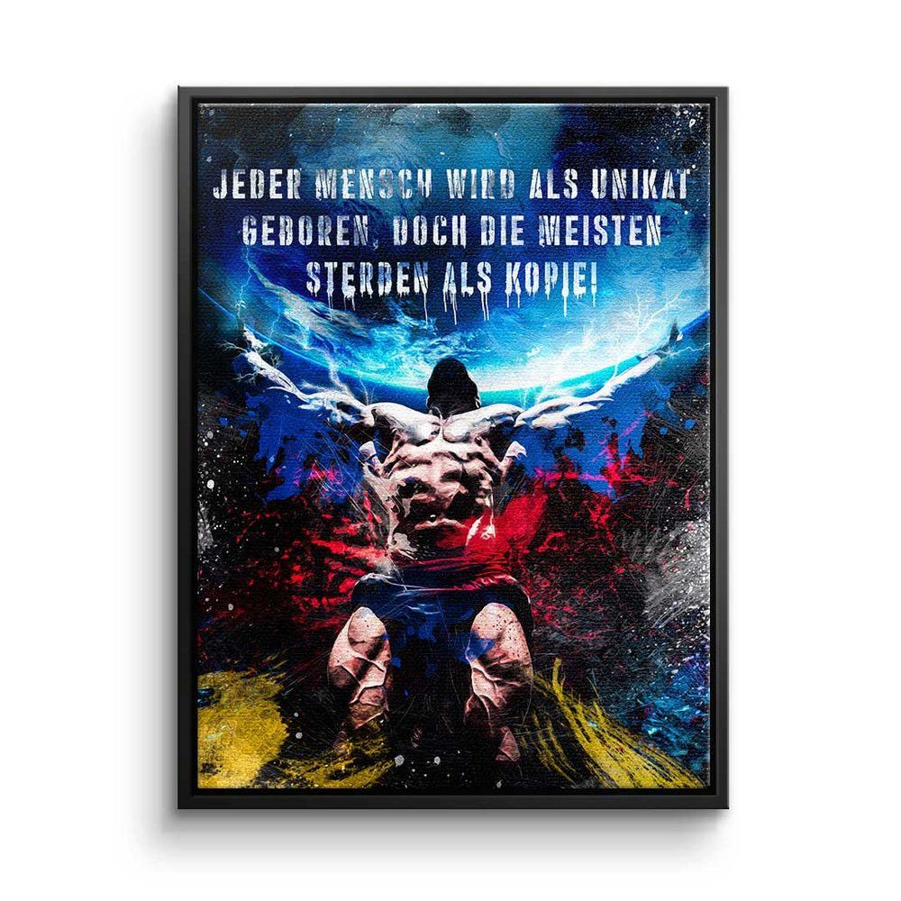 DOTCOMCANVAS® Premium Leinwandbild mit motivierendem Bodybuilder und Schriftzug. Bleib du selbst und gehe an deine Grenzen!