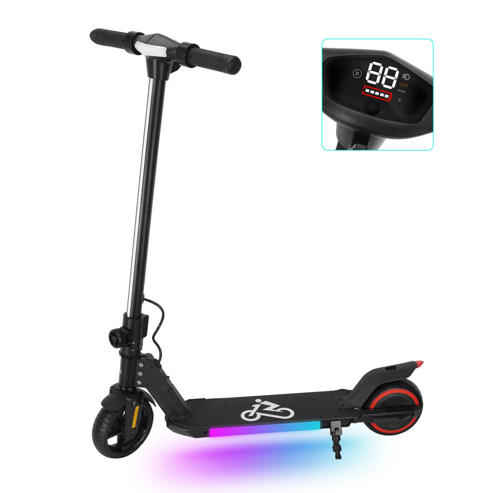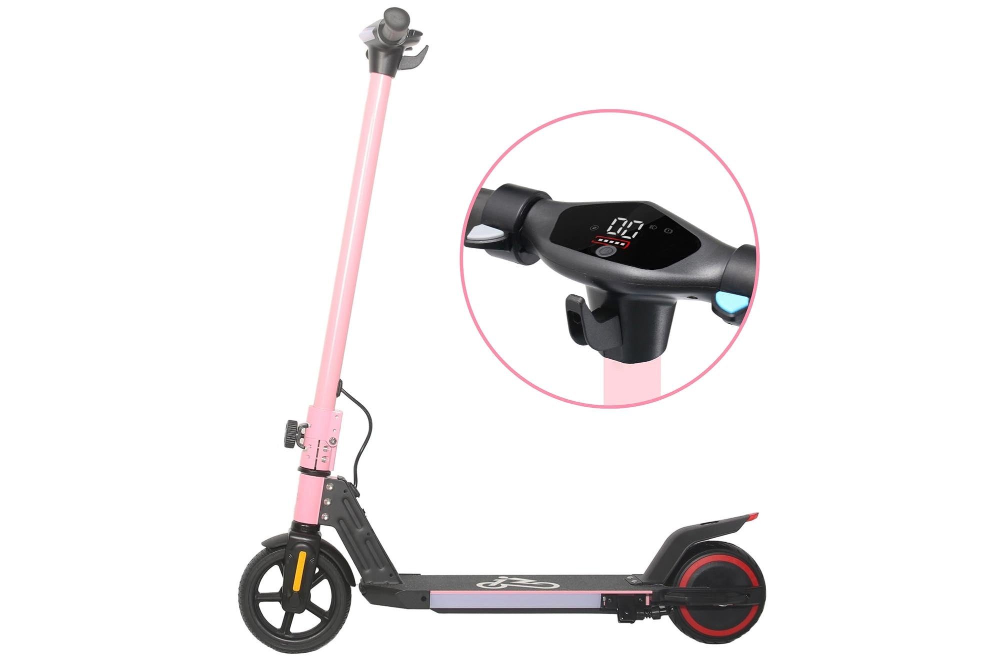 Der tragbare Elektroroller ist leicht und faltbar und lässt sich einfach verstauen und transportieren. Die LED-Beleuchtung an Karosserie und Unterseite sorgt für Fahrspaß. Erhältlich in drei Farben: Schwarz, Blau und Pink – eine modische Wahl für Kinder von 6 bis 12 Jahren.