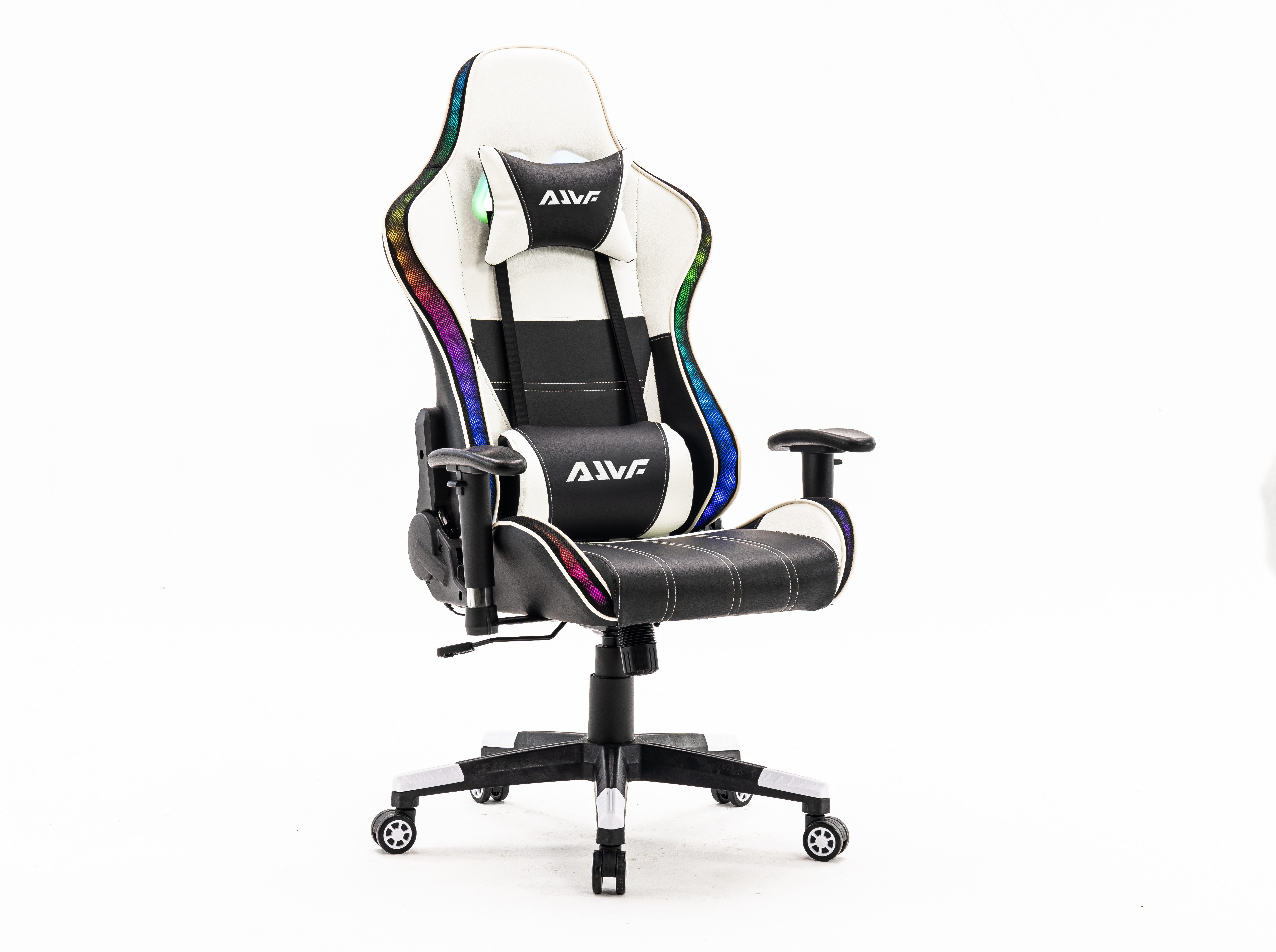 Dieser Gaming-Stuhl ist mit Kunstleder bezogen und daher leicht zu reinigen. Die mitgelieferten gepolsterten Kopf- und Lendenkissen sorgen für zusätzlichen Komfort beim Arbeiten. Die Höhe dieses Bürostuhls ist dank des Gasfedermechanismus einstellbar. Wenn Sie ein Nickerchen machen möchten, können Sie die Rückenlehne einfach in der vollständig zurückgelehnten Position arretieren. Außerdem ist der Stuhl um 360 Grad drehbar und kann dank seiner 5 Räder leicht bewegt werden. Die Ränder der Rückenlehne sind mit LED-Leuchten ausgestattet, die für eine bessere Spielatmosphäre sorgen. Mit der Fernbedienung können Sie ganz einfach die Farbe des Lichts und den Blinkmodus ändern.
