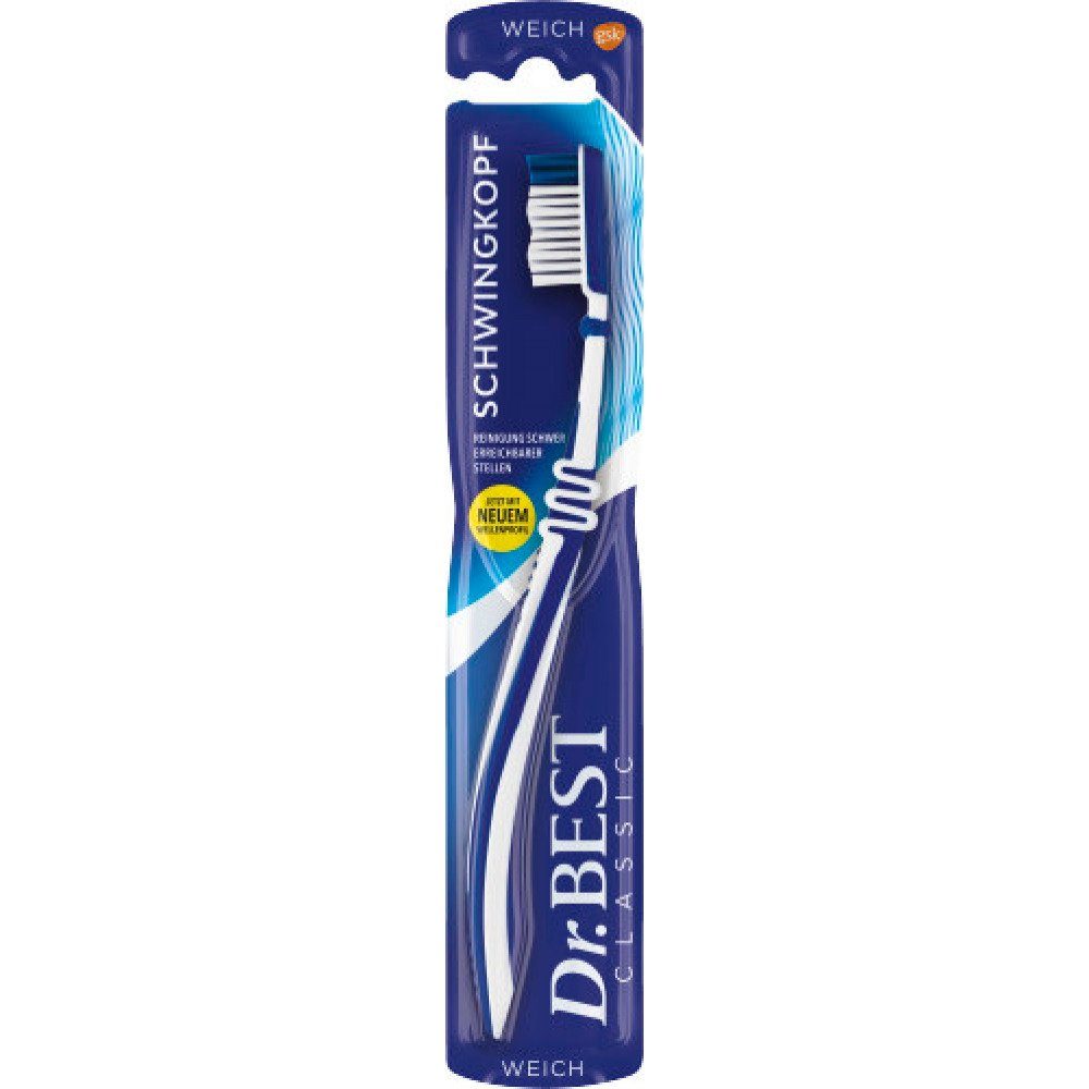 Die Dr.Best Zahnbürste Schwingkopf weich bietet eine innovative Lösung für die tägliche Zahnpflege mit besonderer Rücksicht auf Empfindlichkeit und Effektivität. Durch das einzigartige Kugelgelenk passt sich der flexible Bürstenkopf optimal dem Verlauf Ihrer Zahnreihe an, womit selbst schwer erreichbare Stellen effektiv gereinigt werden können. Diese Anpassungsfähigkeit wird durch einen speziell entwickelten, wellenförmigen Bürstenschnitt unterstützt, der der natürlichen Kontur Ihrer Zähne folgt. Dies erleichtert nicht nur die Reinigung, sondern sorgt auch für ein angenehmes und schonendes Putzerlebnis. Der gepolsterte Bürstenkopf schont empfindliches Zahnfleisch und minimiert das Risiko von Verletzungen. Dank der integrierten Spezial-Federung gibt die Zahnbürste bei zu starkem Druck nach, um die Zahnfleischgesundheit zu fördern. Ergänzt wird die Funktionalität durch sorgfältig abgerundete Borsten, die für eine sanfte Pflege und gründliche Reinigung sorgen. Der ergonomisch gestaltete, gummierte Griff mit Noppenverstärkung ermöglicht eine sichere Handhabung und optimale Kontrolle während des Putzens.