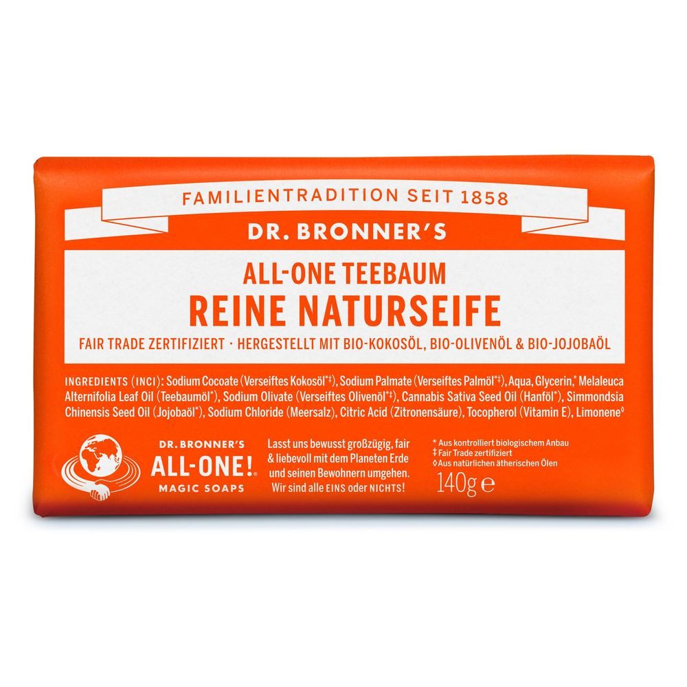 Die verseiften Öle reinigen schonend und natürlich, ohne zu fetten, und sind aus kontrolliert biologischem Anbau nach dem „National Organic Standards“-Programm zertifiziert. Die Seifen sind biologisch abbaubar, vegan und werden in zu 100% recyceltem Altpapier eingewickelt. Außerdem sind sie frei von synthetischen Schaumbildnern, Verdickungsmitteln, Petrochemikalien und Konservierungsstoffen. Der samtige Schaum entsteht nur durch die spezielle Mischung natürlicher Zutaten, der eine jahrelange Erfahrung zu Grunde liegt. Die Einhaltung unserer Fair Trade Standards wird regelmäßig durch das angesehene Schweizer Zertifizierungsunternehmen IMO überprüft. Sie fundieren auf unseren Werten, die Dr. Bronner’s nun schon seit 150 Jahren innehat und deren Kern der faire Umgang mit Mensch, Tier und Natur ist. Mit Dr. Bronner’s kannst Du jeden Tag dazu beitragen, die Welt ein kleines Stückchen besser zu machen. “We are All-One or None!“