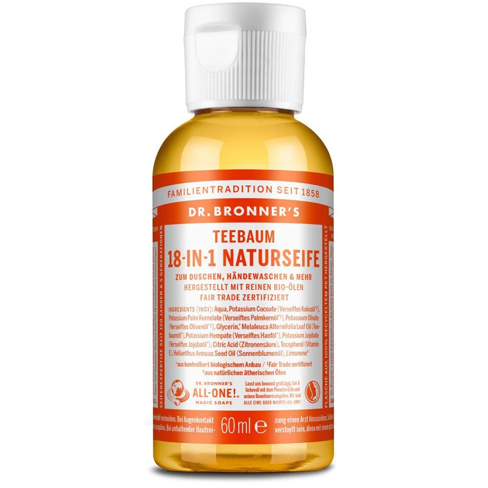 Inhaltsstoffe | Aqua, Potassium Cocoate (Verseiftes Kokosöl*‡), Potassium Palm Kernelate (Verseiftes Palmkernöl*‡), Glycerin,* Potassium Olivate (Verseiftes Olivenöl*‡), Melaleuca Alternifolia Leaf Oil (Teebaumöl), Potassium Hempseedate (Verseiftes Hanföl*), Potassium Jojobate (Verseiftes Jojobaöl*), Citric Acid (Zitronensäure), Tocopherol (Vitamin E), Helianthus Annuus Seed Oil (Sonnenblumenöl), Limonene,? Linalool?, Benzyl Alcohol? * Aus kontrolliert biologischem Anbau ‡ Fair Trade zertifiziert ? Aus natürlichen ätherischen Ölen |