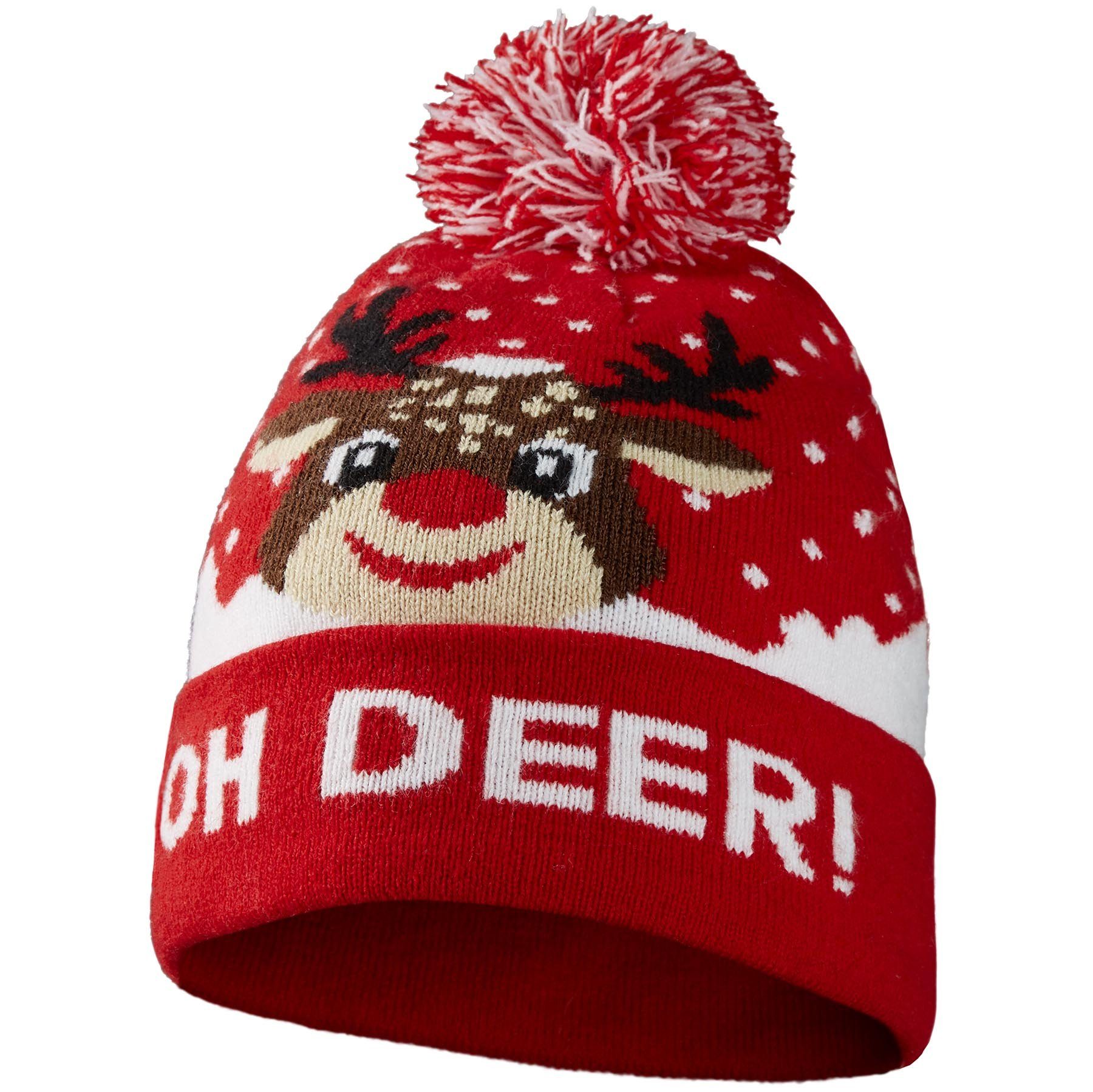 Die süße Rentier-Mütze mit Schriftzug steigert die Weihnachtsfreude. Unterhalb des großen Bommels ist eine Schneelandschaft abgebildet. Darin befindet sich zentral im vorderen Bereich Rudi Rentier mit seiner typisch roten Nase und einem verschmitzten Lächeln. Darunter ziert der Schriftzug „OH DEER!“ den Umschlagbund. Dank der roten Rentier-Mütze ist Dein Kopf nicht nur ein Eyecatcher sondern auch stets wohlig warm, Material: Acryl.