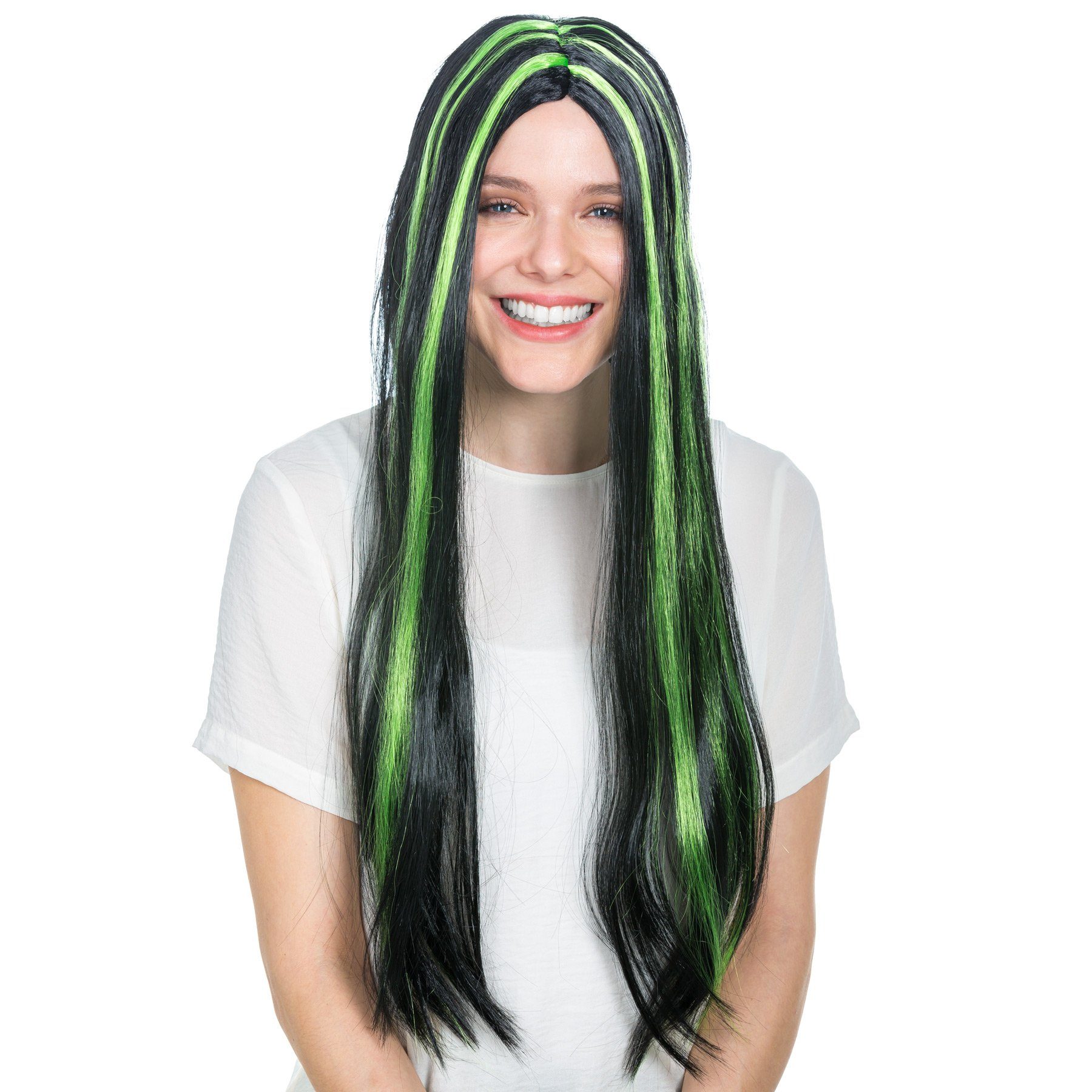 Die langen, glatten Haare der Perücke fallen weich und elegant und sind ca. 65 cm lang. Der traumhafte Mittelscheitel verleiht der Perücke einen modernen und zugleich klassischen Look, der perfekt zu Vampir- oder Gothickostümen passt. Die tiefschwarze Haarfarbe sorgt für eine geheimnisvolle Ausstrahlung, während die dezente Kombination mit angesagten Strähnen den Stil noch eindrucksvoller macht.