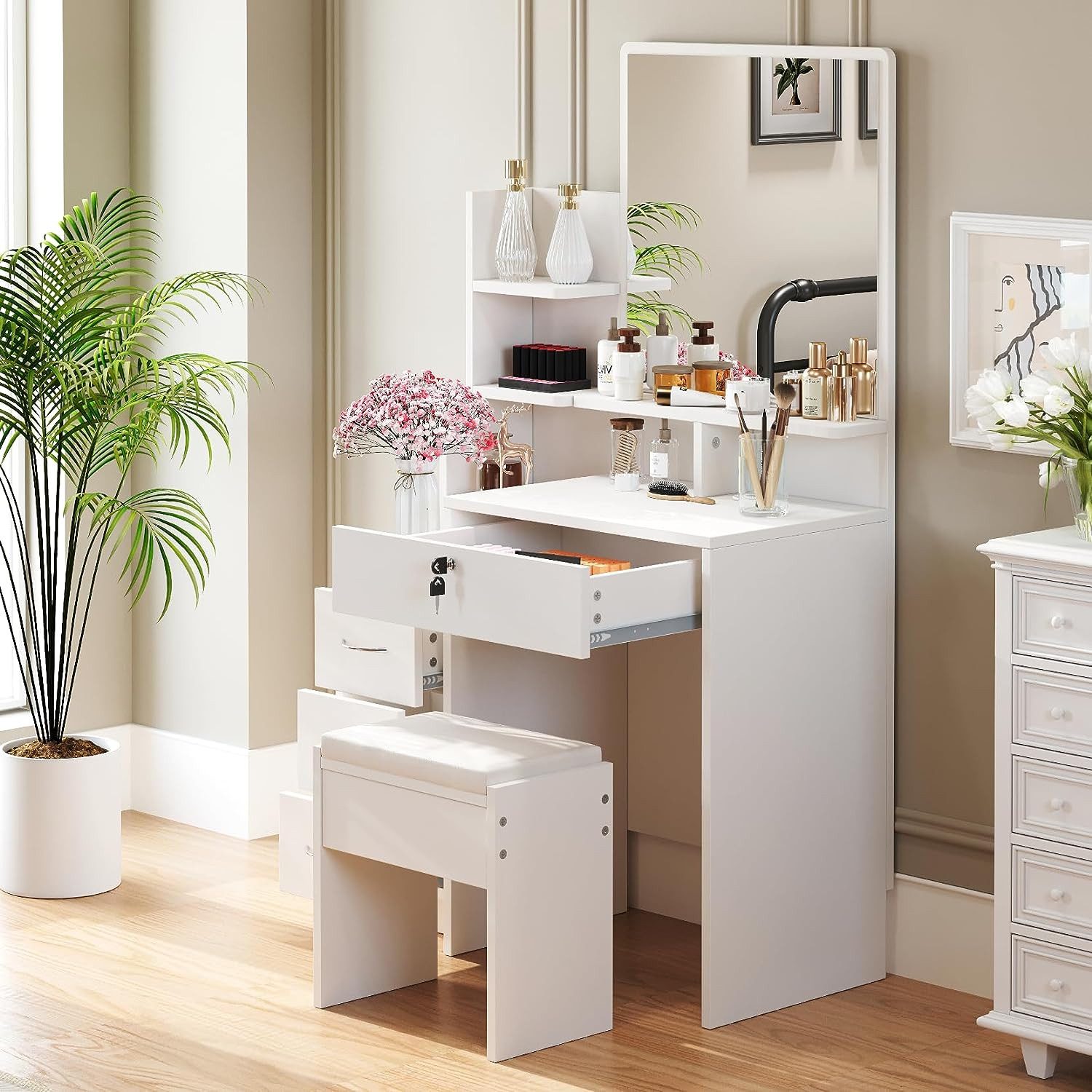 Mit 4 Schubladen und 7 praktischen Ablagefächern bietet er reichlich Stauraum für all Ihre Kosmetikprodukte, Schmuck und Beauty-Accessoires.