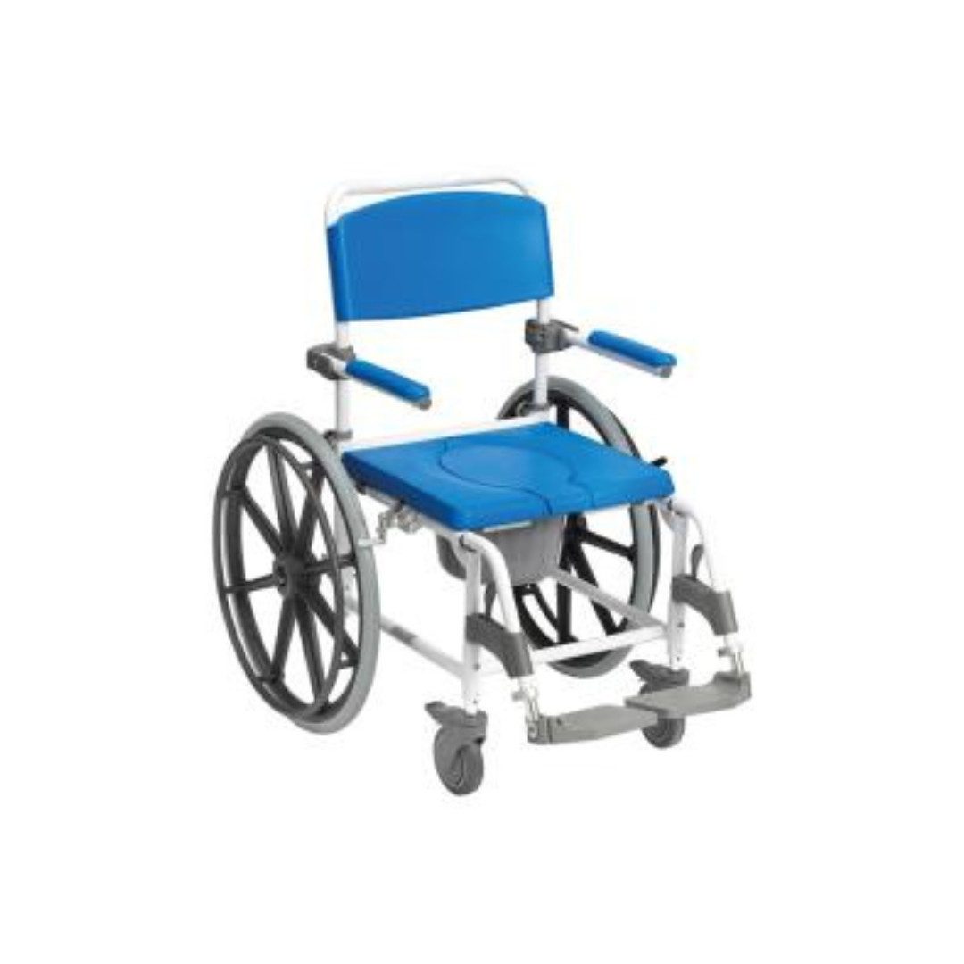 Drive Medical - Dusch-Toilettenrollstuhl Aston 24"; Räder, Selbstfahrer Dusch-Toilettenrollstuhl Aston 24"; Räder, Selbstfahrer - eine vielseitige Lösung für das Duschen und die Toilette Der Aston Dusch - und Toilettenrollstuhl bietet eine vielseitige Lösung für das Duschen und die Toilette. Die Armlehnen sind nach hinten hochklappbar und die Fußstützen abschwenkbar, höhenverstellbar und abnehmbar. Der Dusch - und Toilettenrollstuhl besitzt eine Softsitz. Dieser ist mit zwei Hygieneöffnungen versehen, um die Pflege des Intimbereiches zu erleichtern. Die vordere Hygieneausspaarung ist offen, dies ist besonders komfortabel für männliche Nutzer. Eine dazugehörigen Abdeckung für die Toilettenöffnung sowie ein Eimer mit Geruchsverschluss gehören zum Lieferumfang. Zum Toilettengang kann der Aston Duschstuhl über das Toilettenbecken gefahren werden. Seine verstellbare Sitzhöhe macht ihn dahingehend flexibel nutzbar für viele Toilettenbecken. Mit seinen 24 Zoll Antriebsrädern ist er als Selbstfahrer geeignet und eignet sich zur Mobilisation und Durchführung einer eigenständigen Körperhygiene. Mit seiner maximalen Belastbarkeit von 160kg ist er auch für große, schwere und adipöse Patienten nutzbar. Merkmale/Komponenten Sitzhöhenverstellung. Schwenk- und abnehmbare Fußstützen. Höhenverstellbare Fußstützen. Serienmäßiger und nach vorne offener Softsitz. Inklusive Abdeckung der Hygieneaussparung. Höchste Qualität durch pulverbeschichtetes Aluminium. Serienmäßiger Eimer in handelsüblicher Ausführung. Hochklappbare Armlehnen. Winkelverstellbare und hochklappbare Fußplatte. Mit großen 24" -Antriebsräder mit Steckachsen und Greifreifen. Höchste Qualität durch pulverbeschichtetes Aluminium. Überfahrbare Höhe 51 cm. Farbe: weiß/blau. HMV-Nr: 18.46.01.0018 Technische Daten Gesamtbreite: 67 cm Gesamtlänge: 117 cm Gesamthöhe: 99 - 103 cm Sitzbreite: 46 cm Sitztiefe: 42 cm Sitzhöhe: 51 / 56 cm Sitzhöhenverstellstufen: 2 Öffnung Breite: 20 cm Öffnung Длина: 26 cm Überfahrbare Höhe: 51 cm Fußstützen Длина: 32 - 50 cm Gesamtgewicht: 19,4 kg Max. Belastung: 160 kg