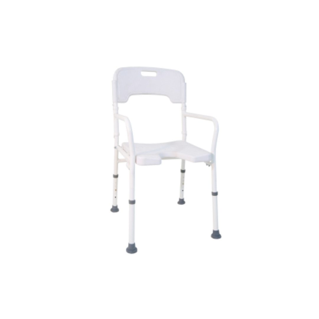 Drive Medical - Duschstul DS130 faltbarer Duschstuhl DSF130 mit Armstützen, Rückenlehne und Hygieneausschnitt Duschstühle und Duschhocker gehören zu den meistgenutzten Hilfsmitteln im Bereich der häuslichen Hygiene. Durch den Einsatz eines Badezimmerhockers wird die Sturzgefahr im Bad minimiert. Dieser Duschstuhl von Drive Medical ist ist durch seine Faltbarkeit leicht zu verstauen und findet bei Nichtbenutzung Platz in jeder Ecke. Das Falten des Duschstuhles bedarf keines Werkzeugs, die Sitzfläche wird einfach nur in die dafür vorgesehenen Halterungen eingeklickt - und schon ist das Hilfsmittel nutzungsbereit. Die Hygienöffnung ist bestens für die Körperpflege im Intimbereich geeignet. Der faltbare Duschstuhl DSF130 besitzt rutschfeste Gummifüße und ist einfach zu reinigen. Seine fünffache Höhenverstellung macht ihn optimal anpassbar an jede Körpergröße. Die seitlichen Armstützen helfen beim Hinsetzen und Aufstehen und die Rückenlehne bieten maximale Sicherheit während der Nutzung. Merkmale/Komponenten Platzsparend durch Faltmechanismus. Mit Arm- und Rückenlehne. Große Sitzfläche mit Ablauflöchern. Hygieneaussparung erleichtert die Intimpflege. Bequem, sicher und stabil. Fünffache Sitzhöhenverstellung durch Teleskopbeine. Sicherer Stand durch Gummifüße. Pulverbeschichteter Aluminiumrahmen. Einfach zu reinigen. Farbe: Weiß. HMV-Nr. 04.40.03.2021 Technische Daten Gesamttiefe: 56 - 58 cm Gesamtbreite: 52 - 53 cm Gesamthöhe: 90 - 100 cm Sitzfläche: 41 x 41 cm Sitzhöhe: 42 - 52 cm Sitzhöhenverstellstufen: 5 Rückenlehnenhöhe: 48 cm Gesamtgewicht: 3,8 kg Maximale Belastbarkeit: 130 kg